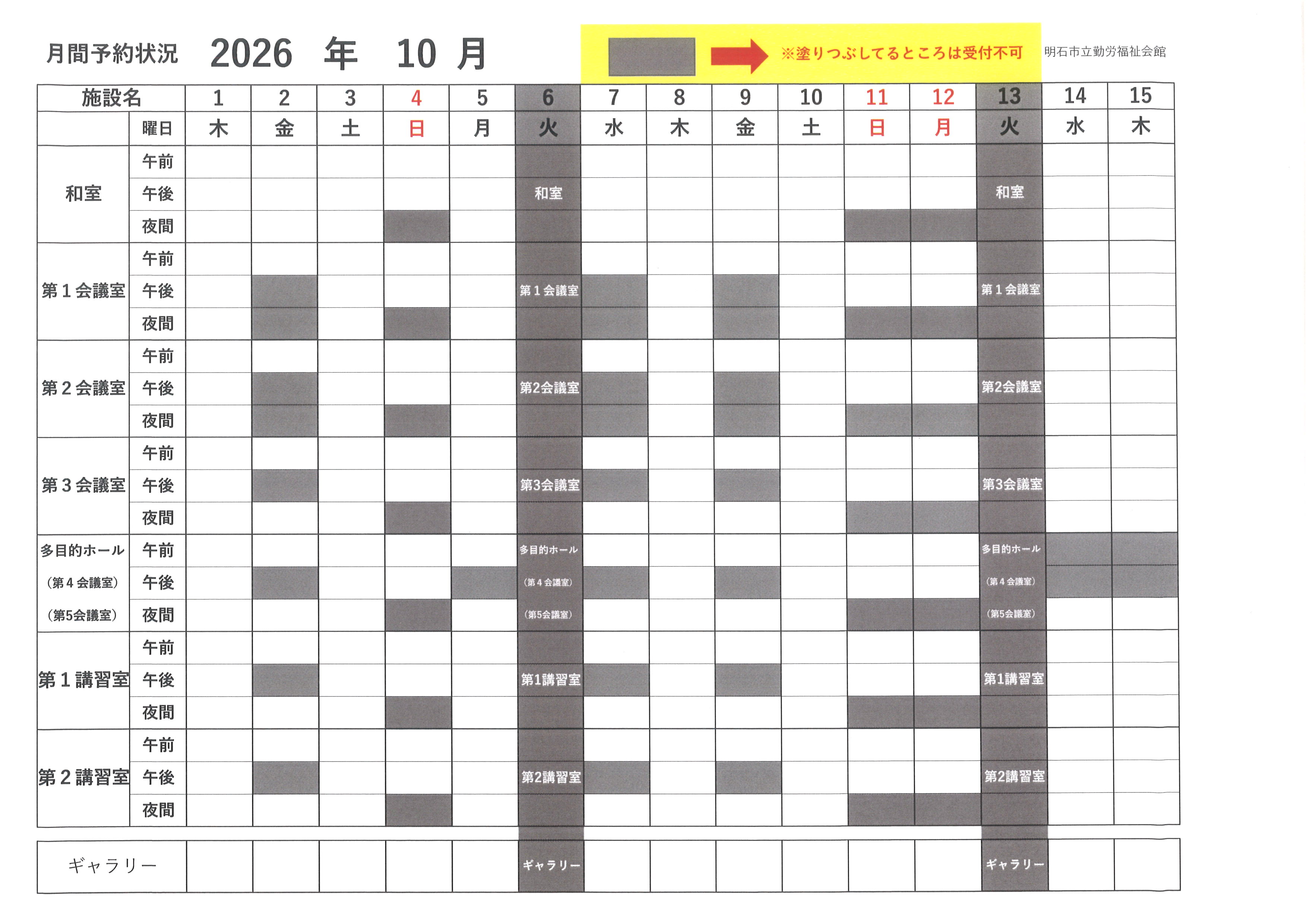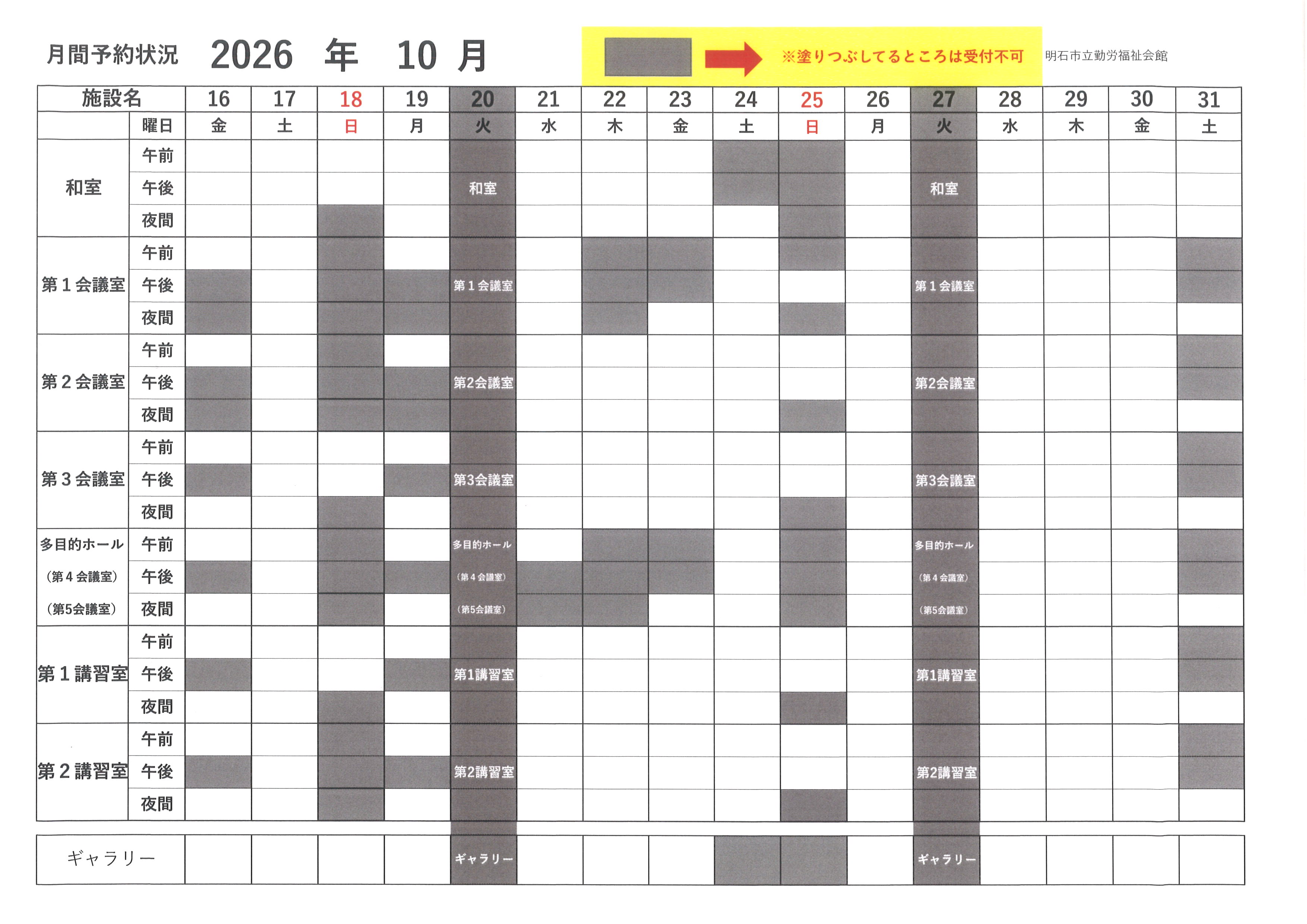 ・塗りつぶしているところは、受付不可です。