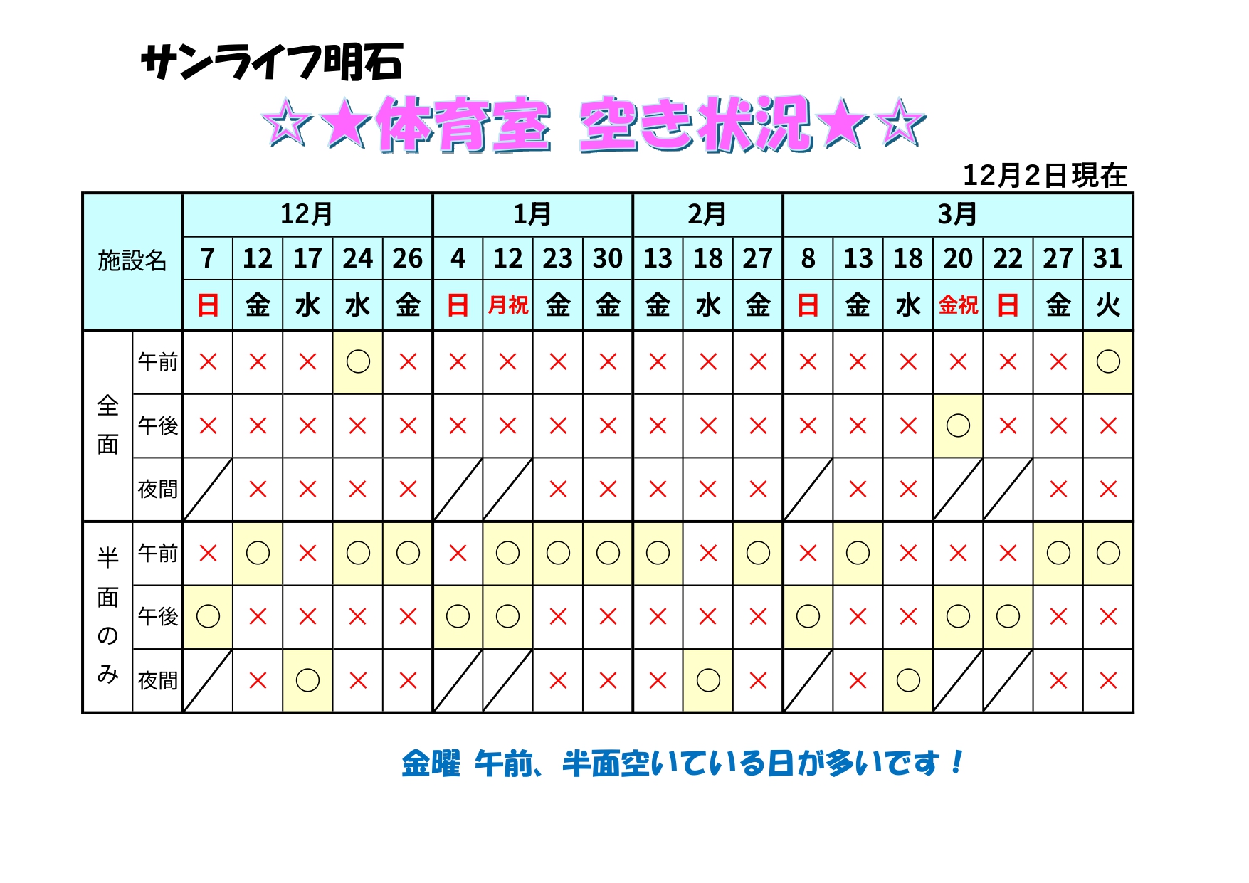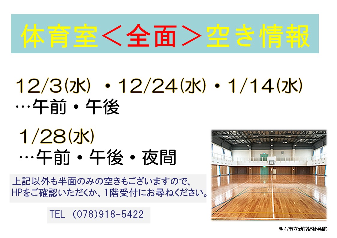 【明石市立勤労福祉会館】11/29体育室の空き状況