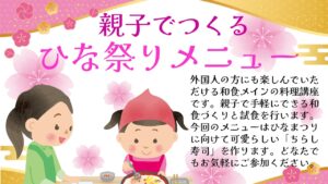 親子でつくるひな祭りメニュー 親子で手軽にできる和食づくりと試食を行います。 今回のメニューはひな祭りに向けて 可愛らしい「ちらし寿司」を作ります。 外国人の方にも楽しんでいただける和食 […]