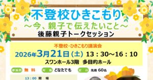 日時:2026年3月21日(土) 13:30~16:10(13:00開場) 開場:スワンホール3階 多目的ホール 参加費:無料 対象:当事者様・ご家族様・支援者様・親の会様・市外の方 どなたでもご参加可能です。 不登校・ […]