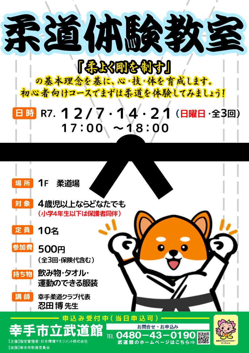 「柔道体験教室」を開催いたします。【日時】 12月 7日・14日・21日 (日曜日)