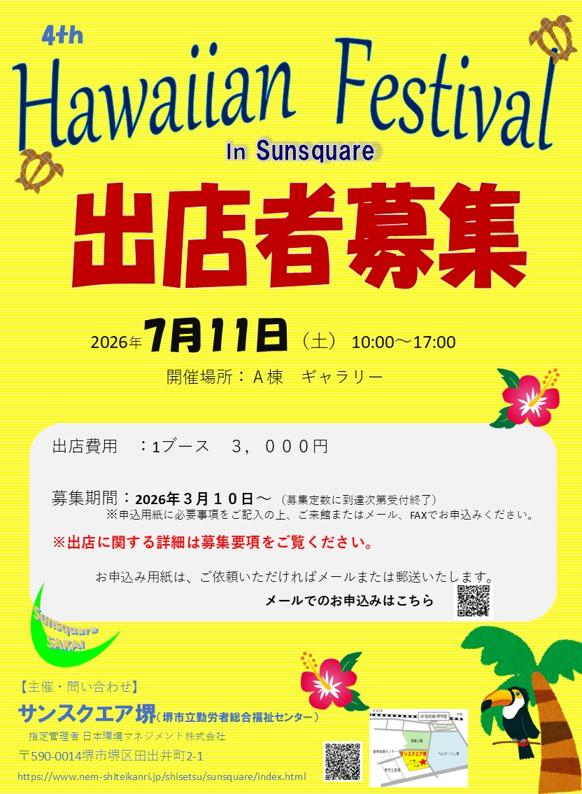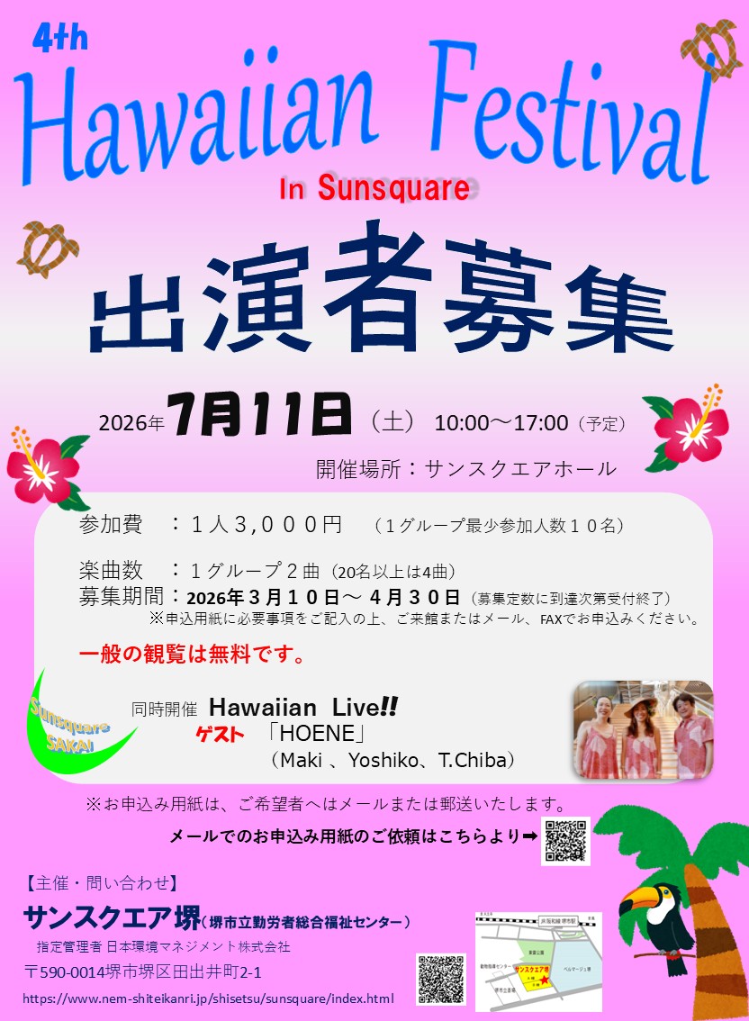第4回 ハワイアンフェスティバルの出演者および出店者を募集いたします。開催日:2026年7月11日(土)