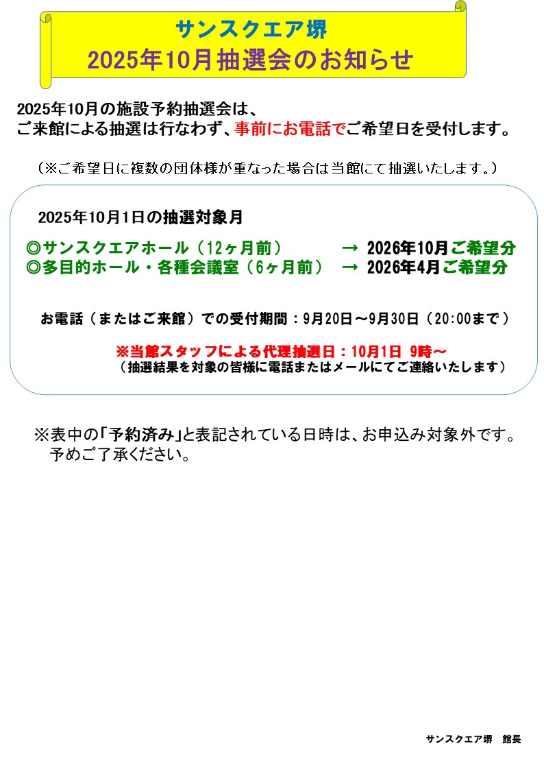※表中の「予約済み」と記されている日時は、公用利用による優先予約のため、お申し込み対象外です。