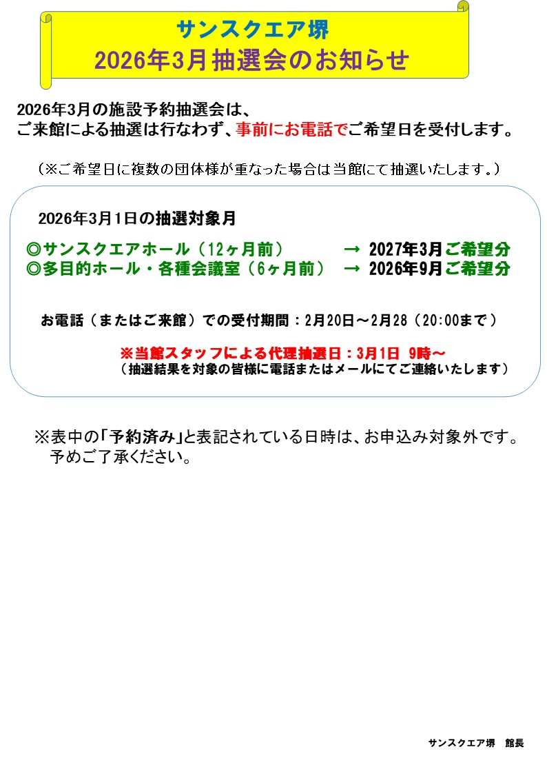 3月1日に2026年9月(サンスクエアホールは2027年3月)の施設利用に向けての抽選を行います。事前受付期間内に利用ご希望日をお電話またはご来館にてお申し込みください。