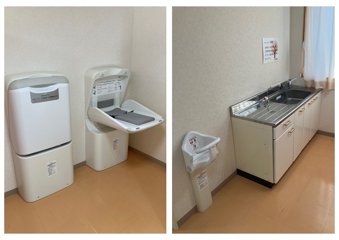 授乳やおむつ替え等ができるスペースです。当施設では、おむつ台(2台)、授乳スペース(2部屋)、幼児用トイレ、流し台を設置しております。
