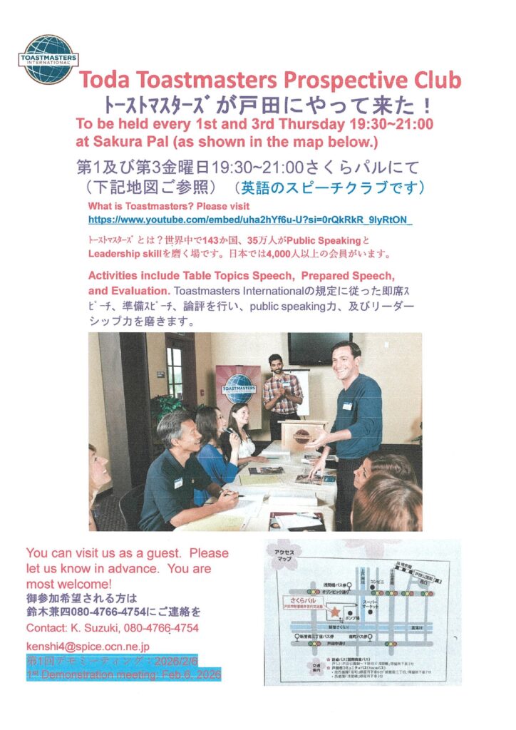 トーストマスターズが戸田にやって来た! トーストマスターズとは世界中で143ヶ国 35万人がPublic SpeakingとLeadership skillを磨く場です。日本では4,000人以上の会員が居ます。Toastmasters Internationalの規定に従った即席スピーチ、準備スピーチ、評論を行い、public speaking力及びリーダーシップを磨きます。