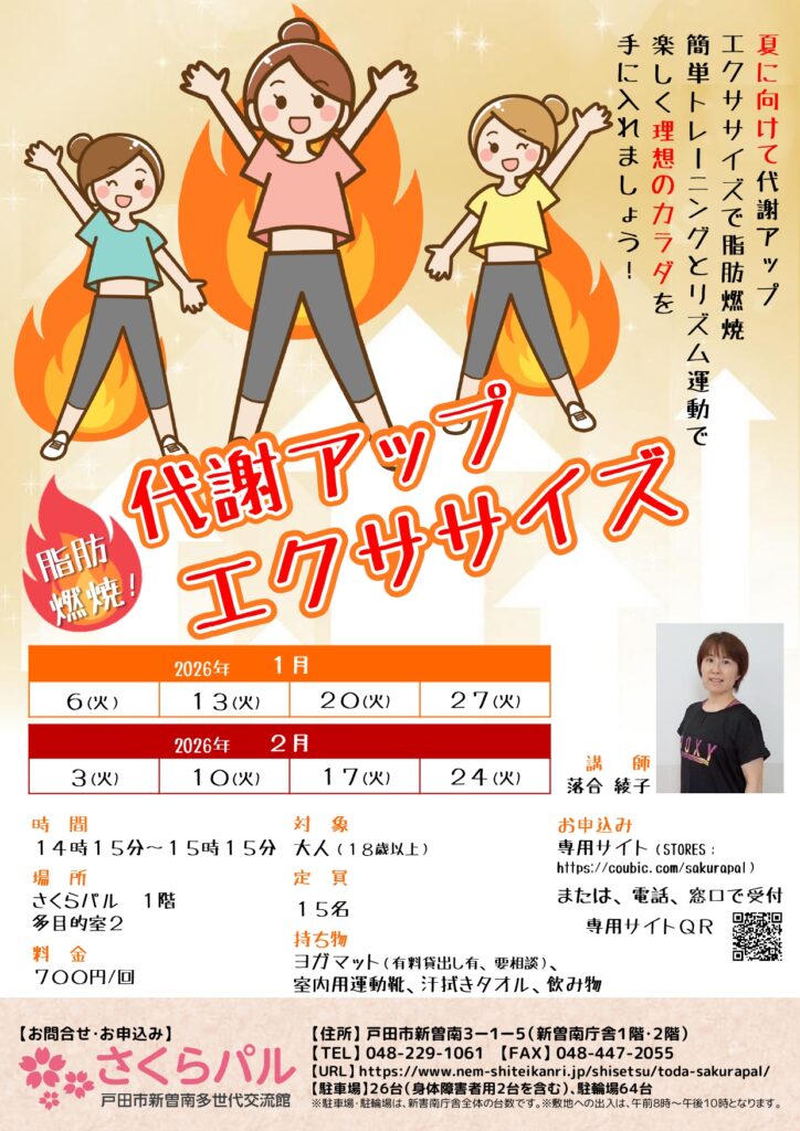 定期教室「脂肪燃焼!代謝アップエクササイズ」2026年1月・2月開催日!