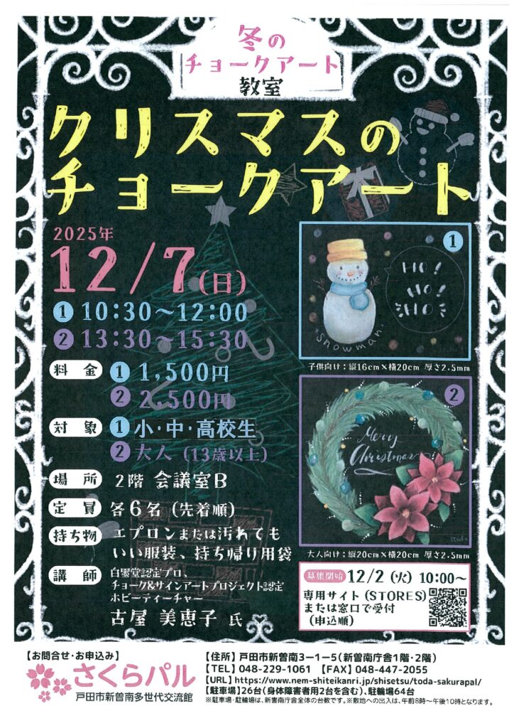 クリスマスのチョークアート教室を開催いたします。今回は①小学生~高校生までのクラスと②大人(13歳以上)の2コースを設けました。