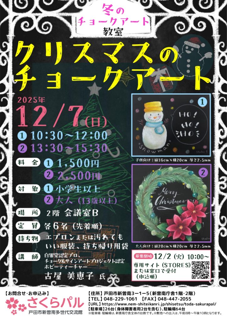 クリスマスのチョークアート教室を開催いたします。今回は①小学生以上と②大人(13歳以上)の2コースを設けました。