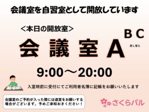 12月25日(木)より、主に学生を対象に 9:00~20:00 の時間帯に利用予約がない空き会議室を自習室として開放しています。 ご利用を希望される方は、2階受付で利用者名簿に必要事項(氏名・連絡先は含まず)を記入した後 […]