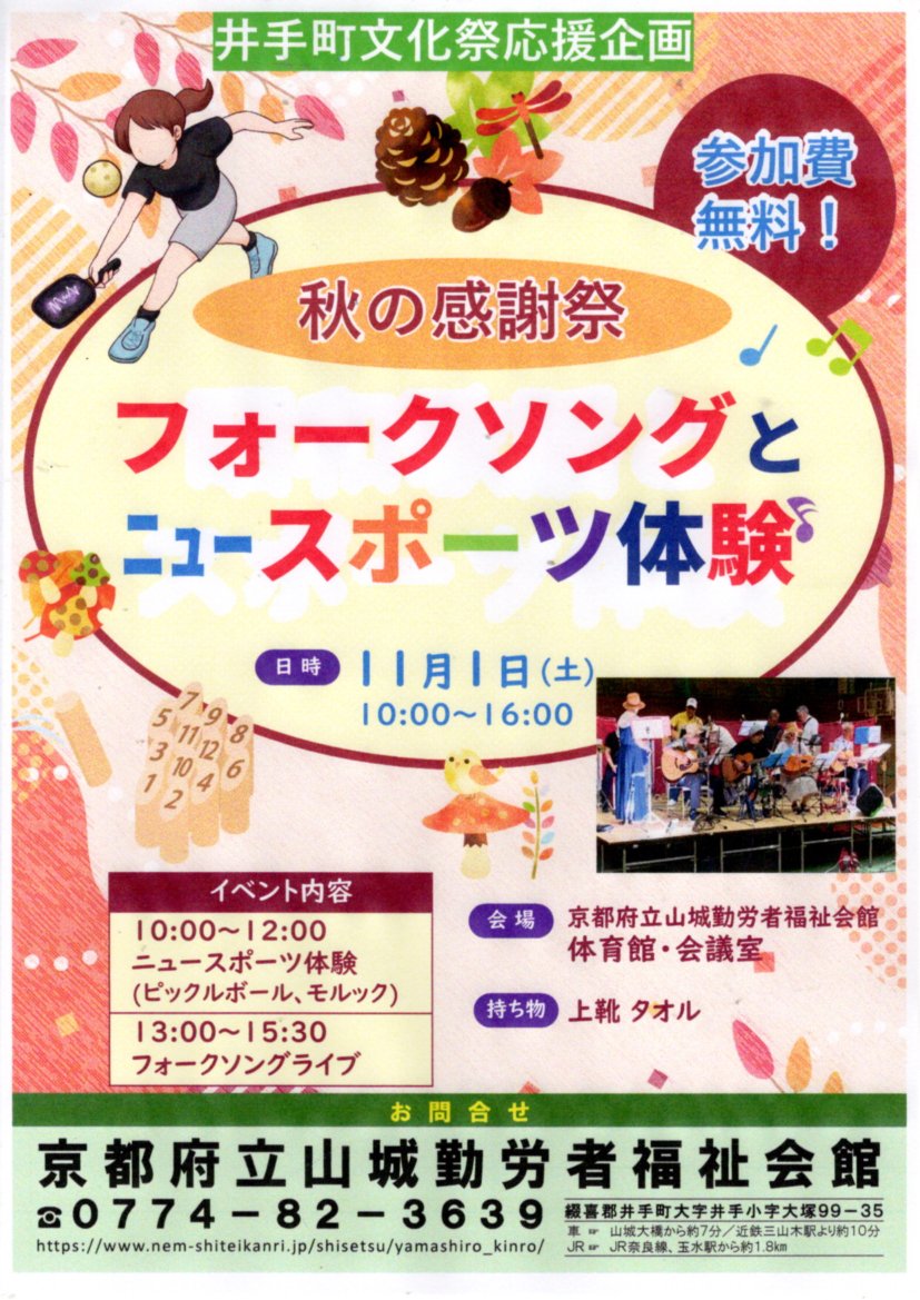 11月1日(土)に[井手町文化祭応援イベント]として開催します。午前はスポーツ体験を楽しみ、午後はフォークソングに耳を傾ける、そんな一日を企画しました。多くの皆さんのご参加をお待ちしています。