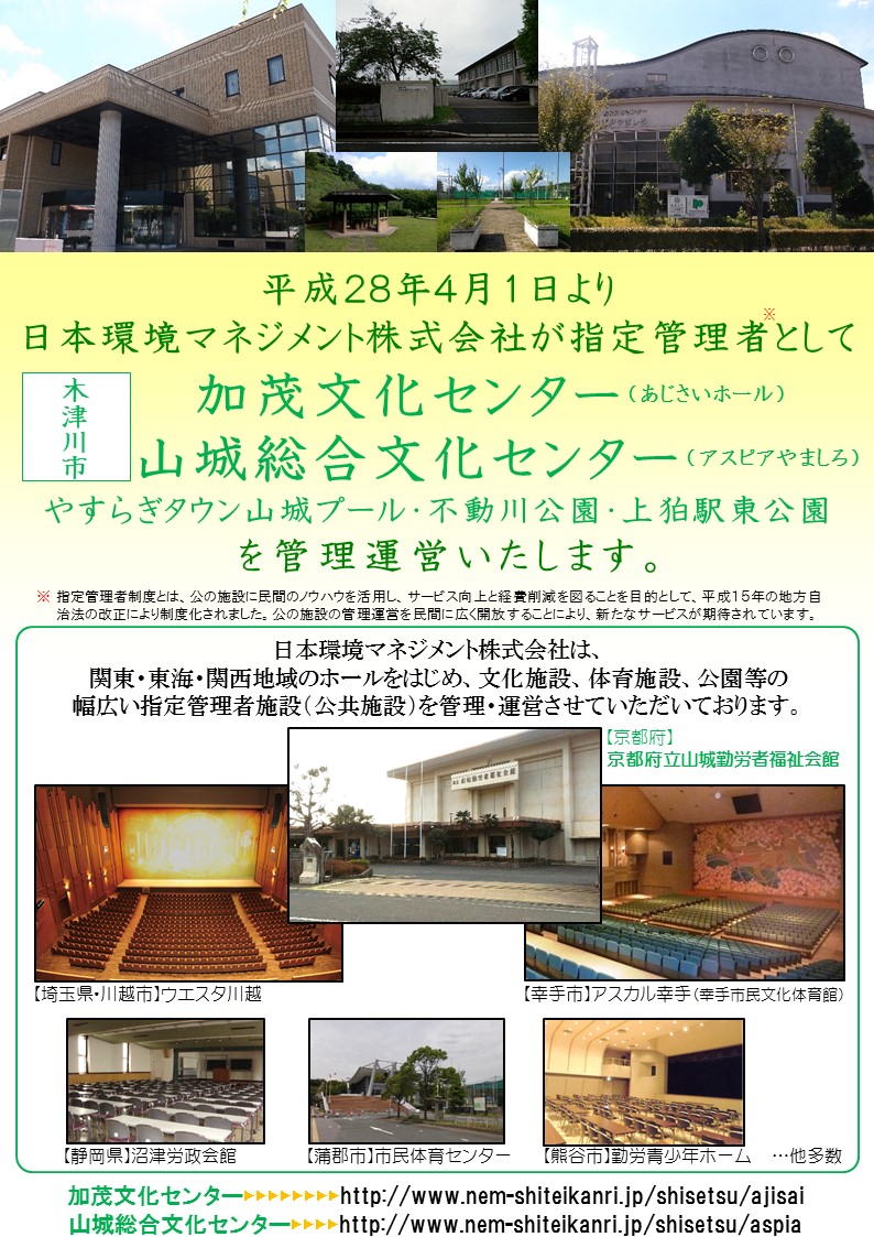 みなさま初めまして。平成28年4月1日より、木津川市加茂文化センタ―(あじさいホール)の指定管理者として、施設を運営・管理いたします日本環境マネジメント株式会社です。