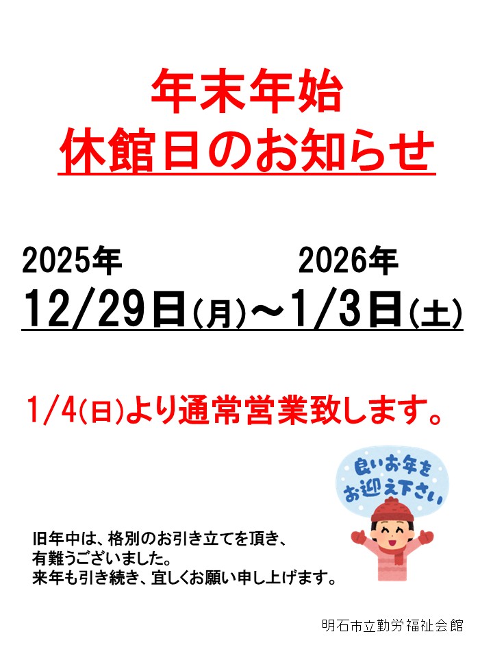 【明石市立勤労福祉会館】年末年始休館のお知らせ