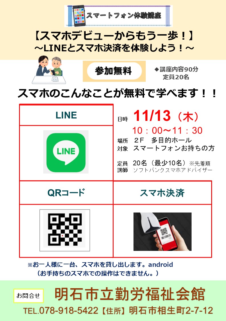 【明石市立勤労福祉会館】スマホ体験講座(LINEとスマホ決済)のご案内