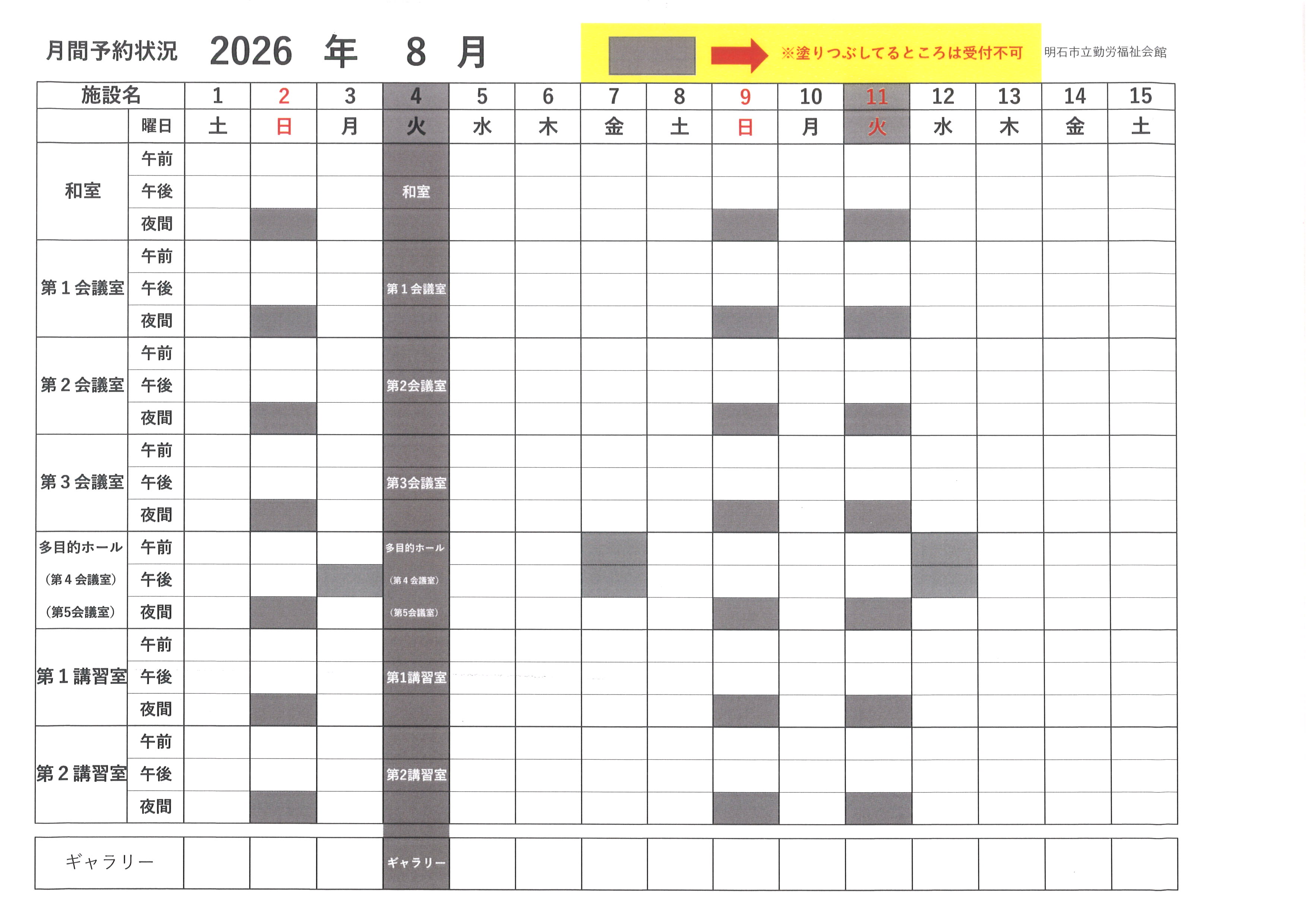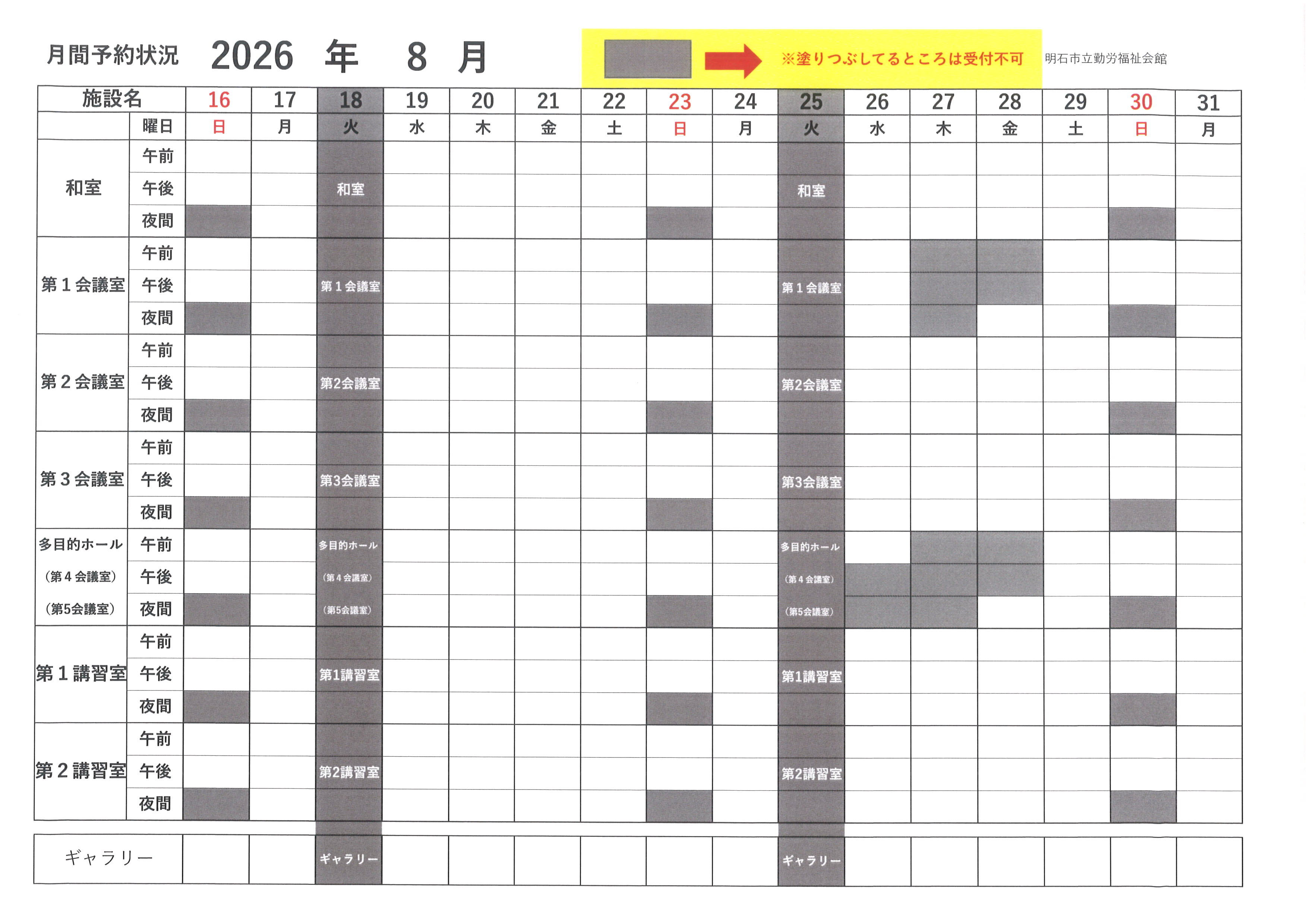 また、他にも空きがございますので、当館HPの『施設の空き状況』でご確認ください。
