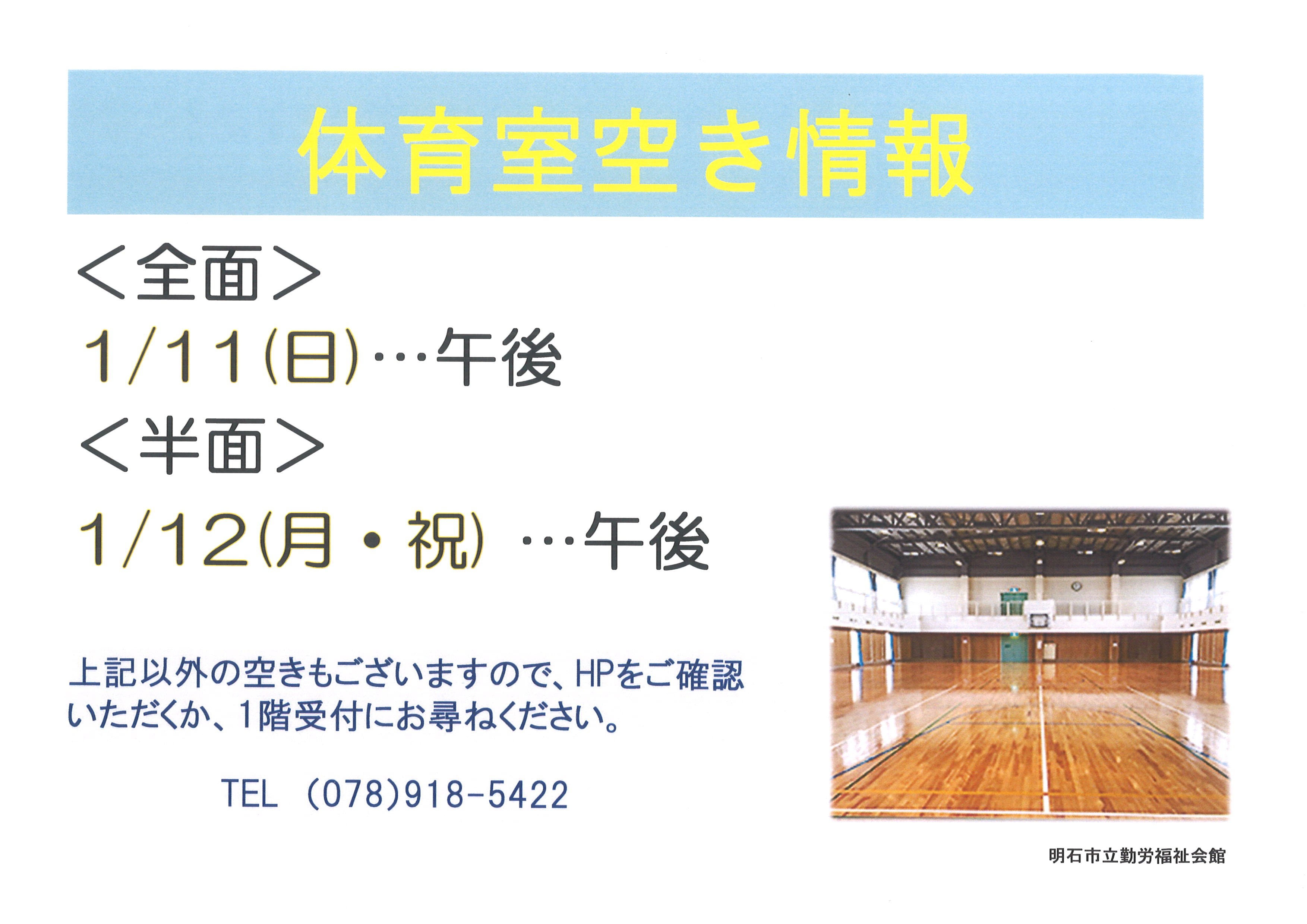 【明石市立勤労福祉会館】体育室<全面>空き情報