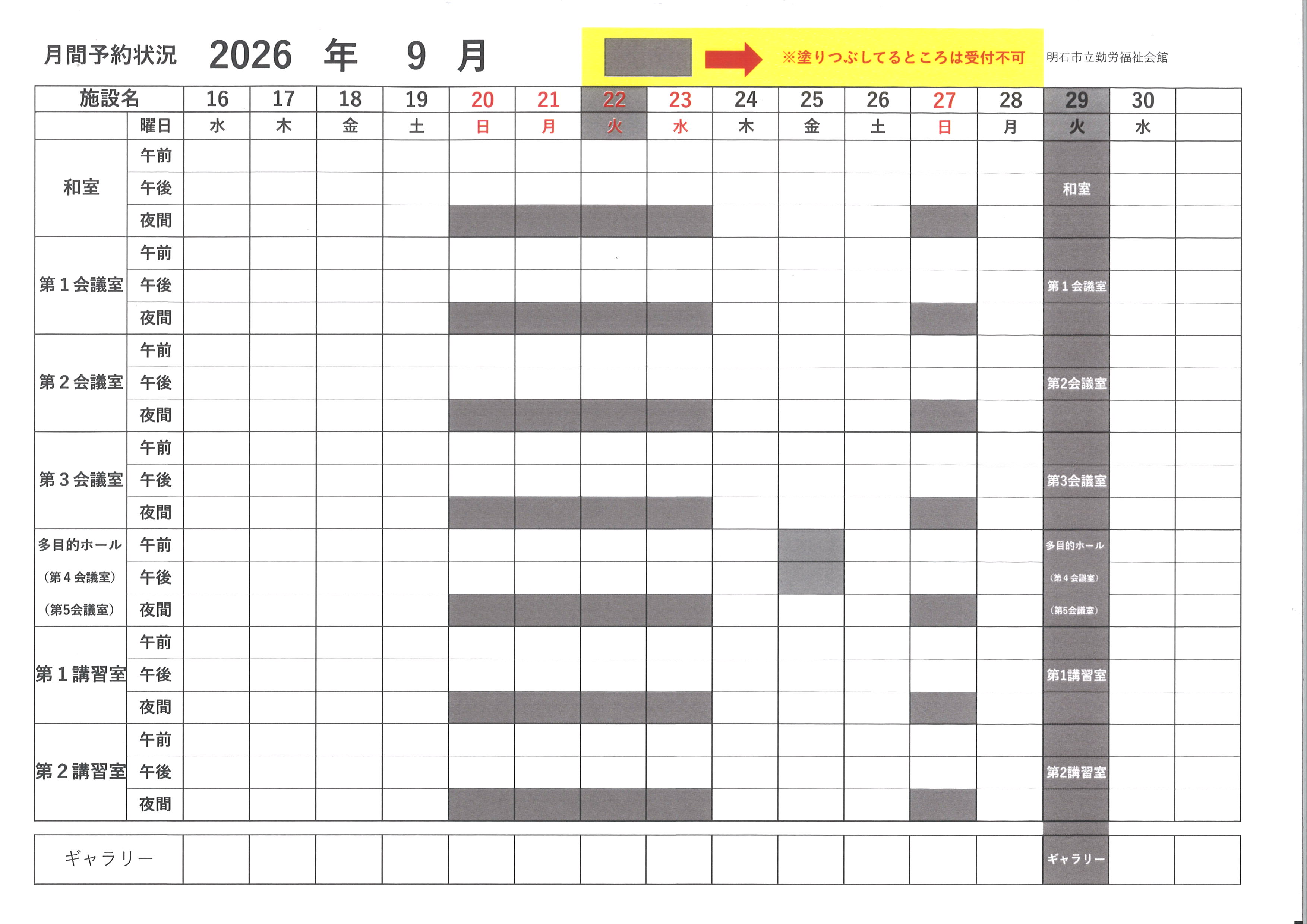 2026年9月会議室・2026年6月体育室の抽選申込カレンダーを更新しました。