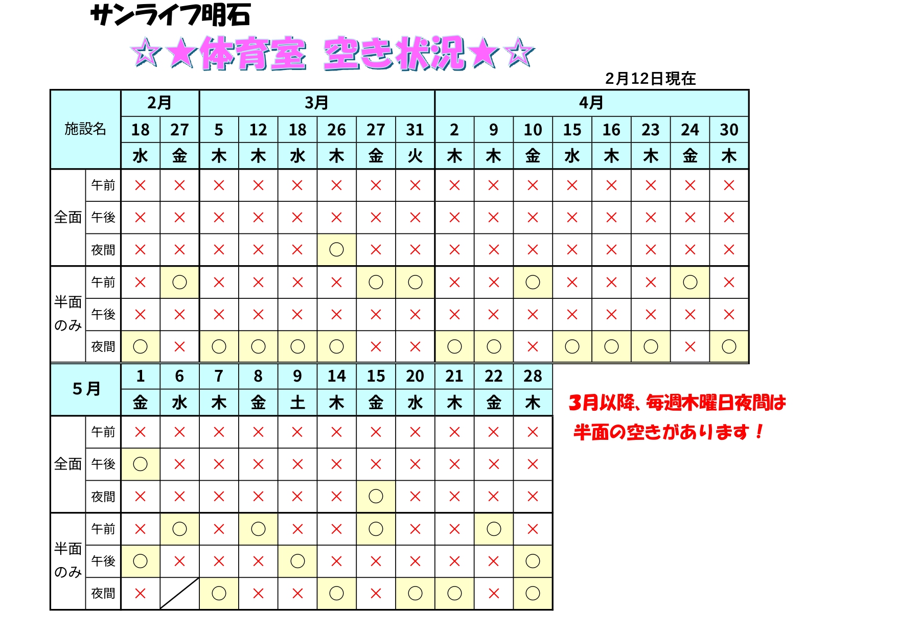 ♪3月以降、毎週木曜日の夜間に半面の空きがあります!