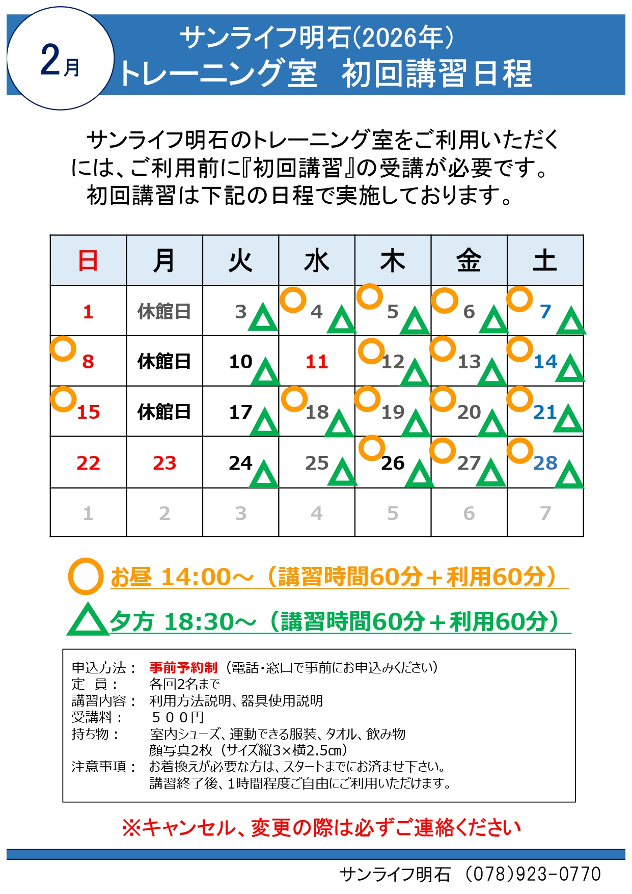 【サンライフ明石 2月トレーニング室初回講習日程】