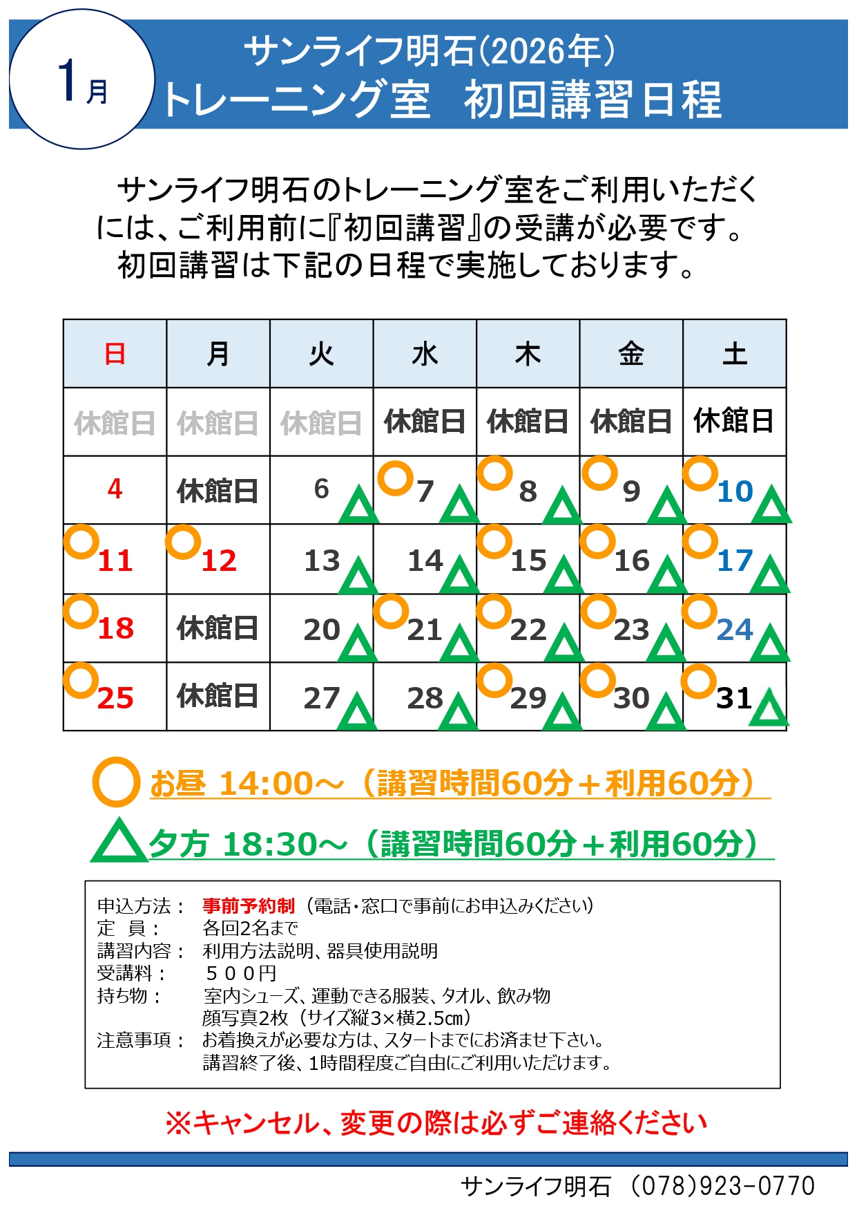【サンライフ明石】1月度トレーニング室 初回講習日程