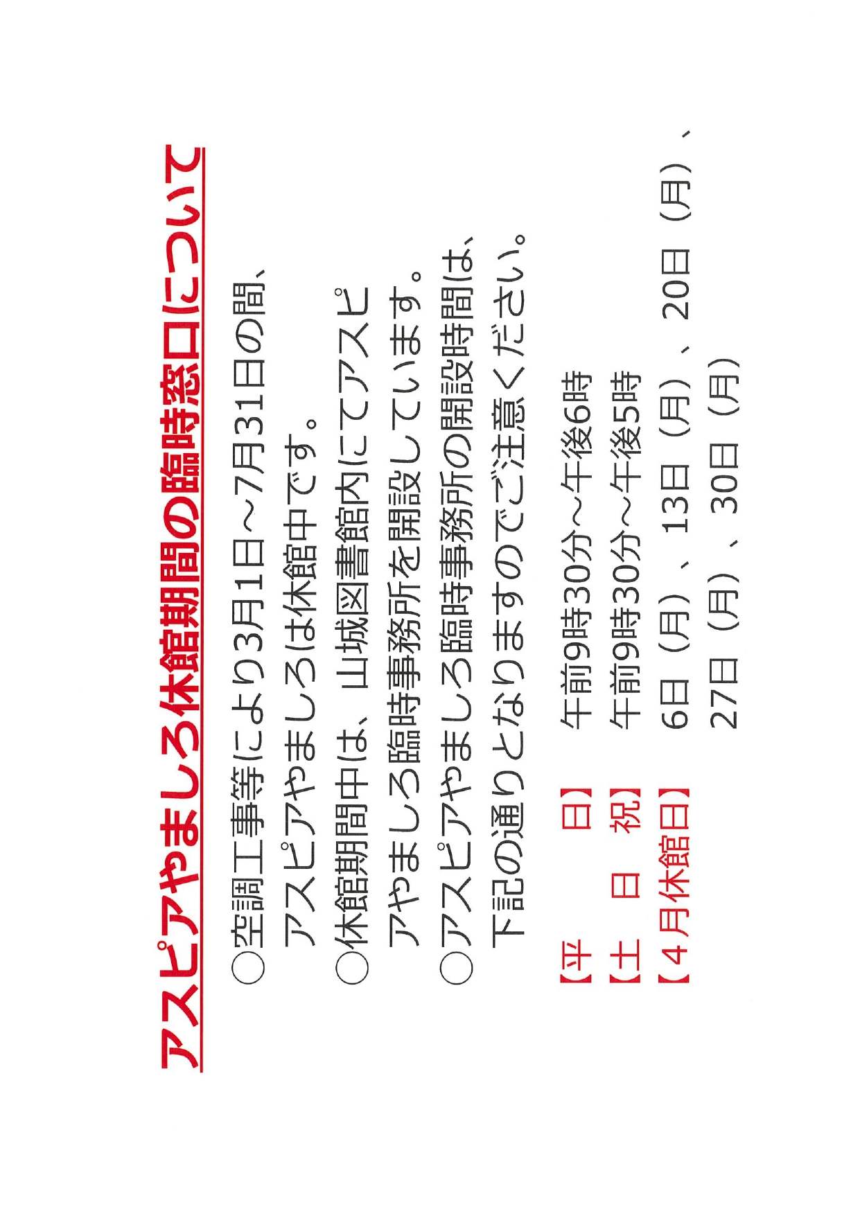 アスピアやましろ休館期間の臨時窓口について〇空調工事等により3月1日〜7月31日の間、アスピアやましろは休館となります