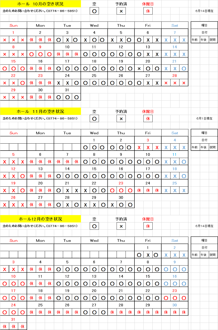 グリーンホール予約状況(10月〜12月)更新のお知らせ