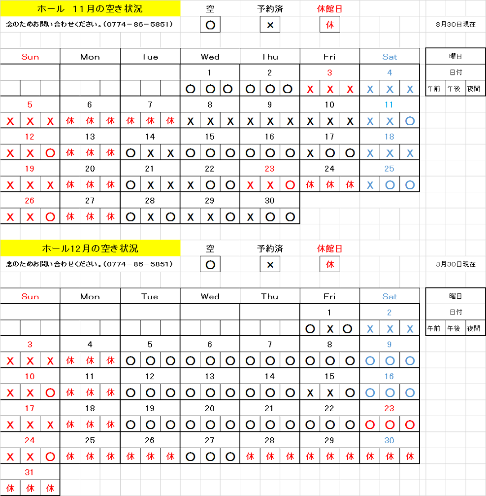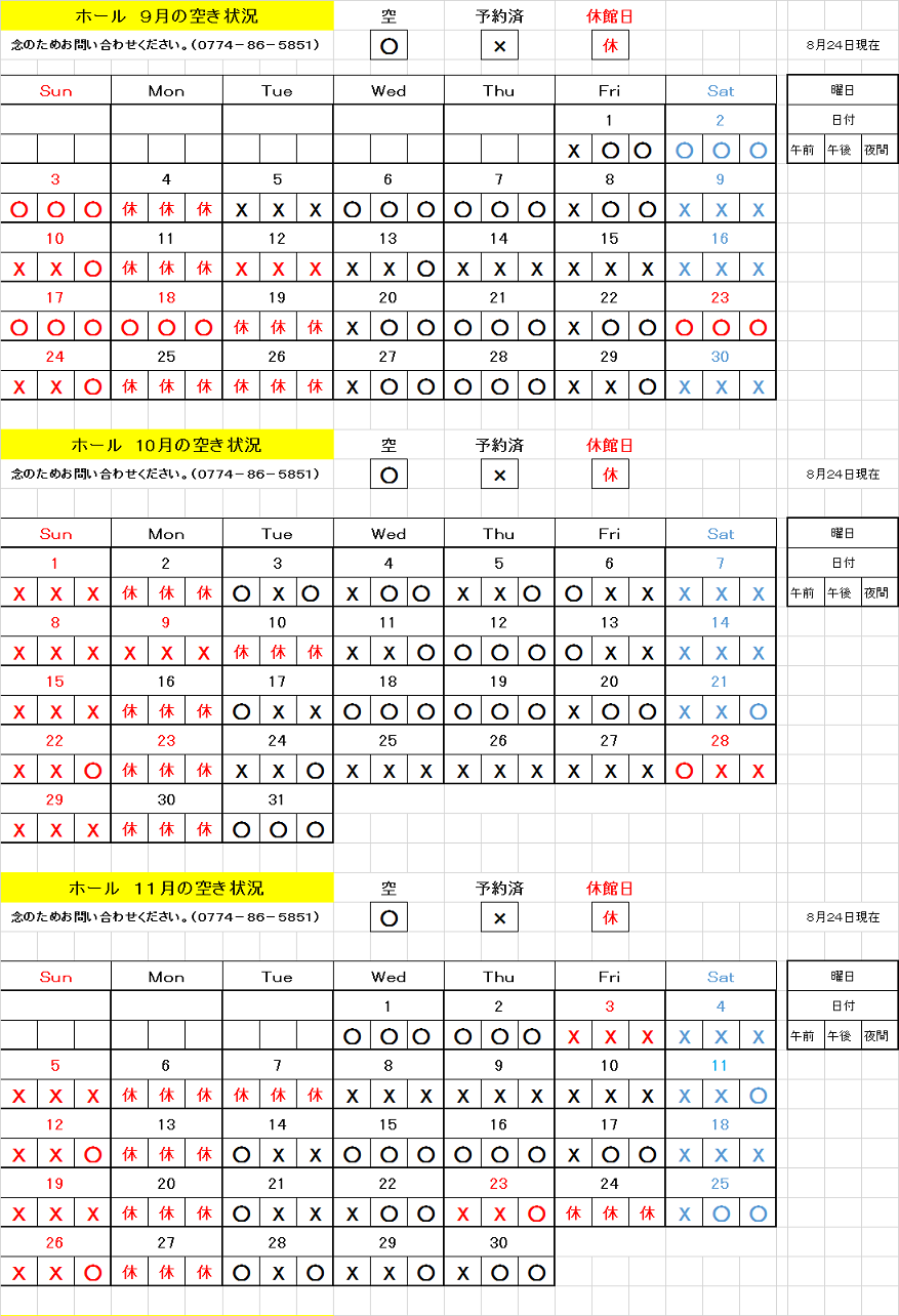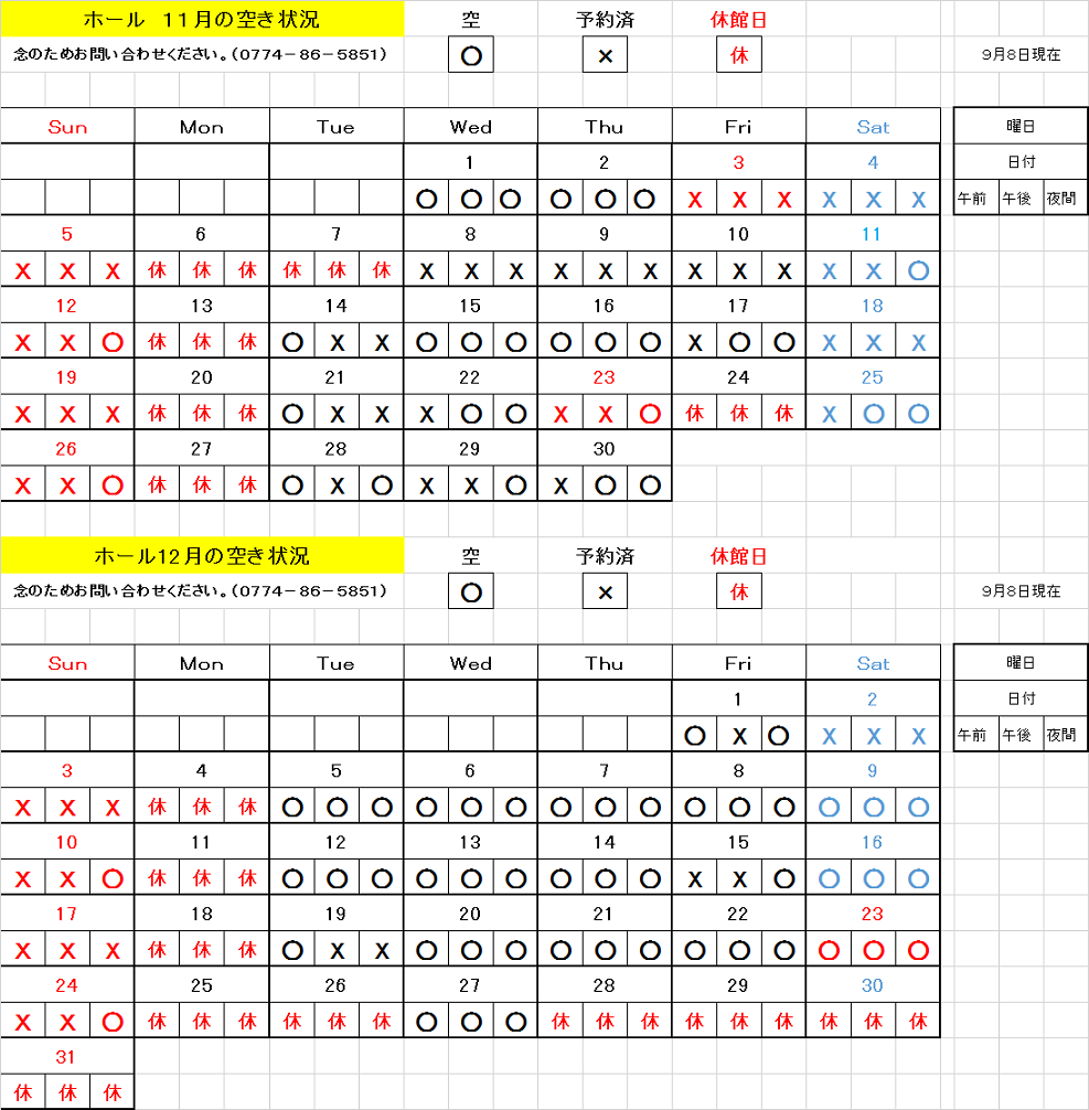 グリーンホール予約状況(9月〜11月)更新のお知らせ