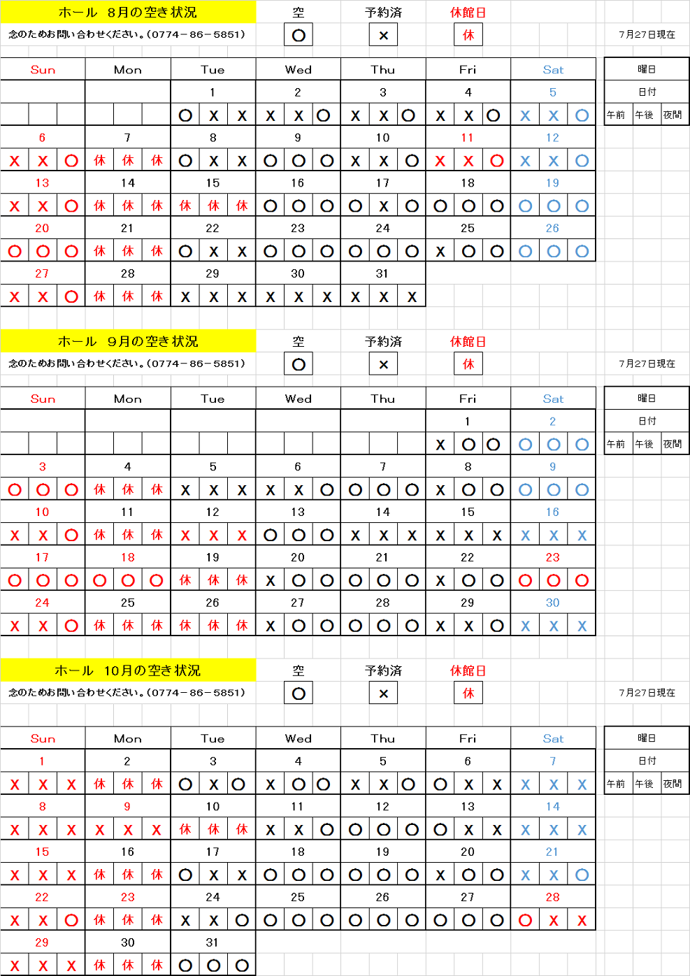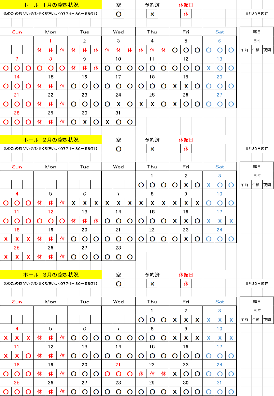 グリーンホール予約状況(8月〜10月)更新のお知らせ