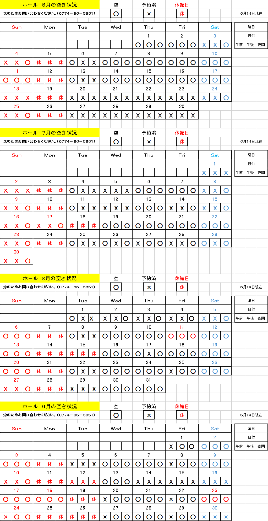 グリーンホール予約状況(6月〜9月)更新のお知らせ