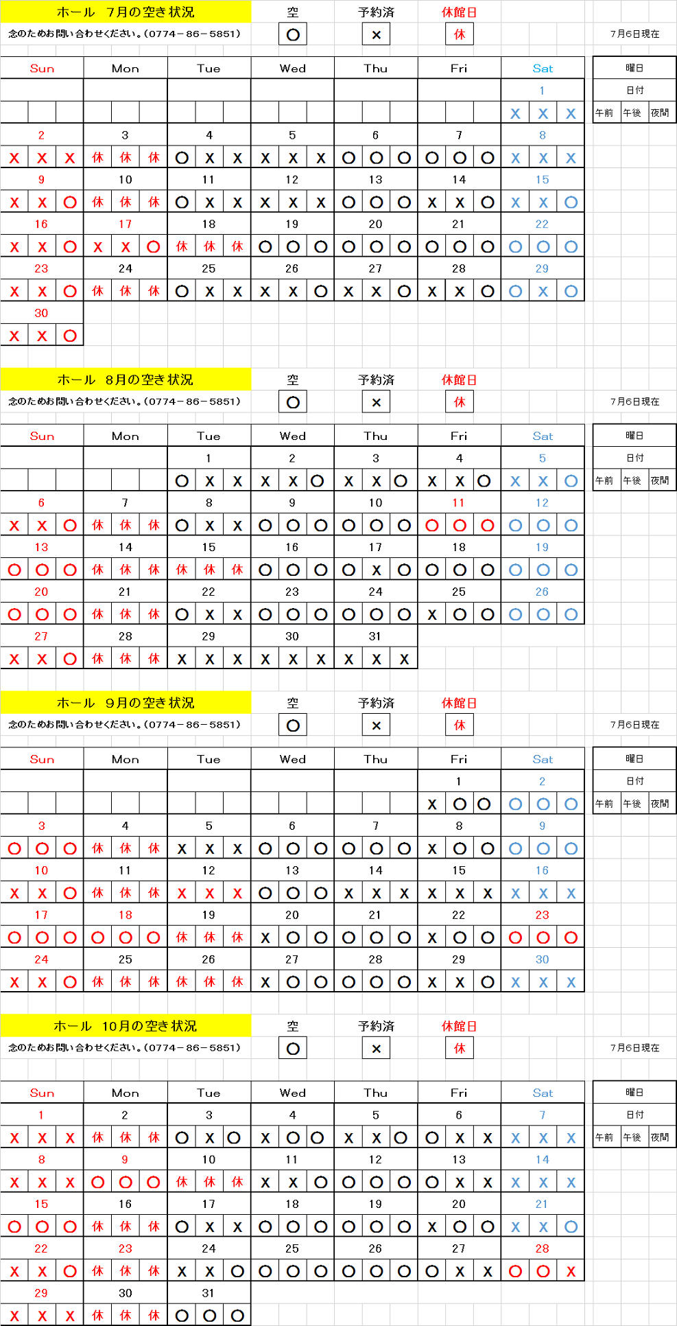 アスピアグリーンホールの予約状況(7月〜10月)を更新いたしました。