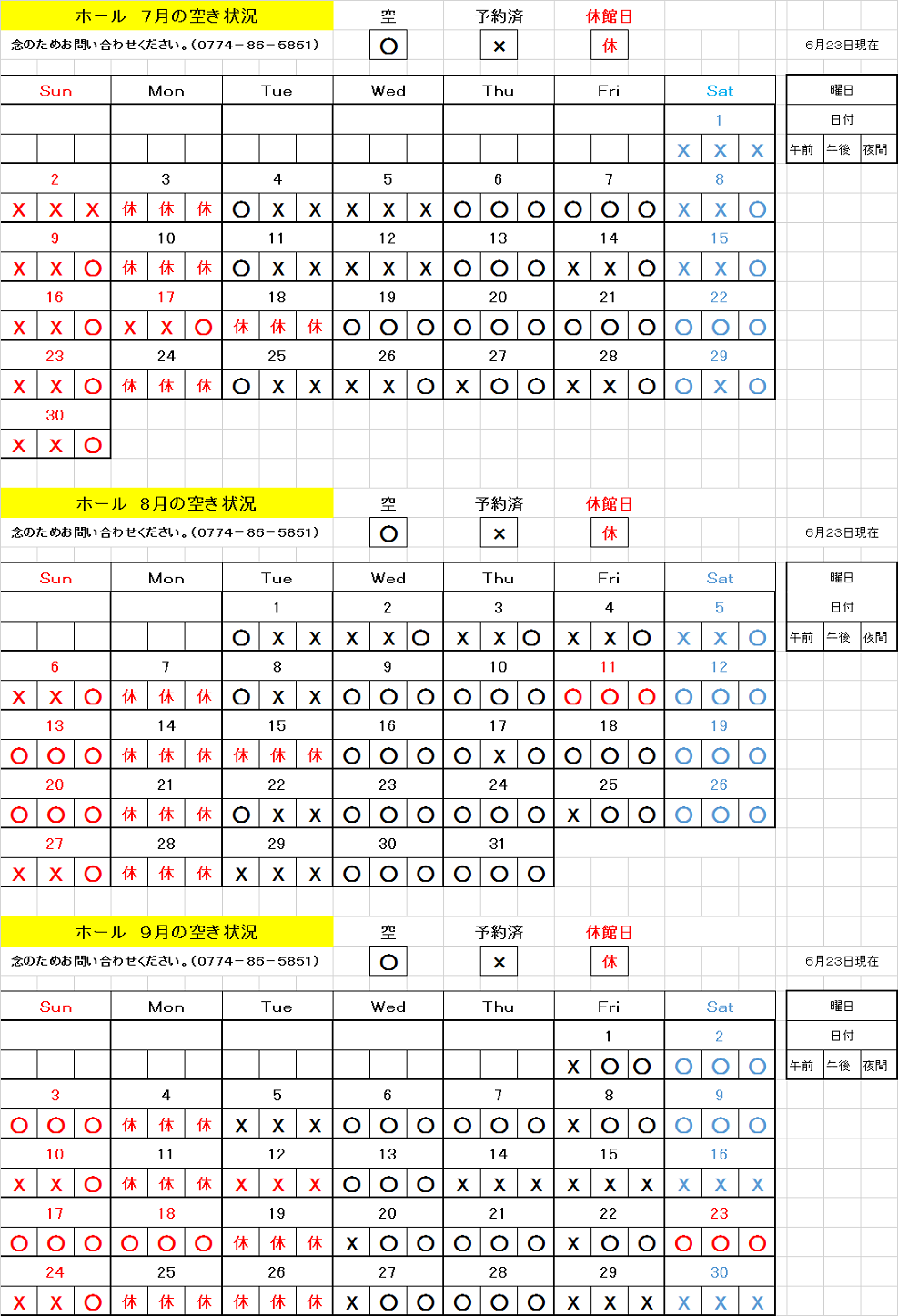 グリーンホール予約状況(7月〜9月)更新のお知らせ
