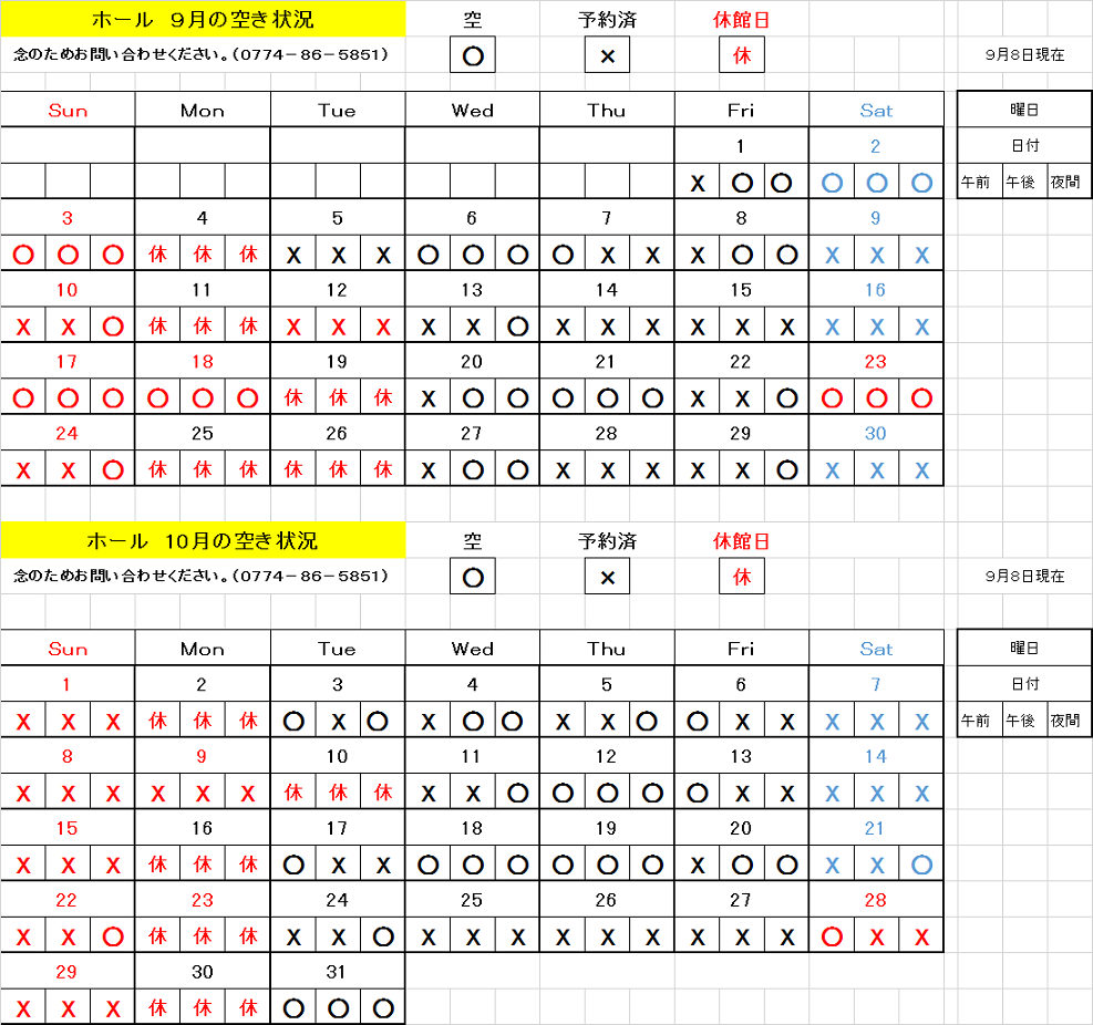 アスピアグリーンホールの予約状況(9月〜10月)を更新いたしました。