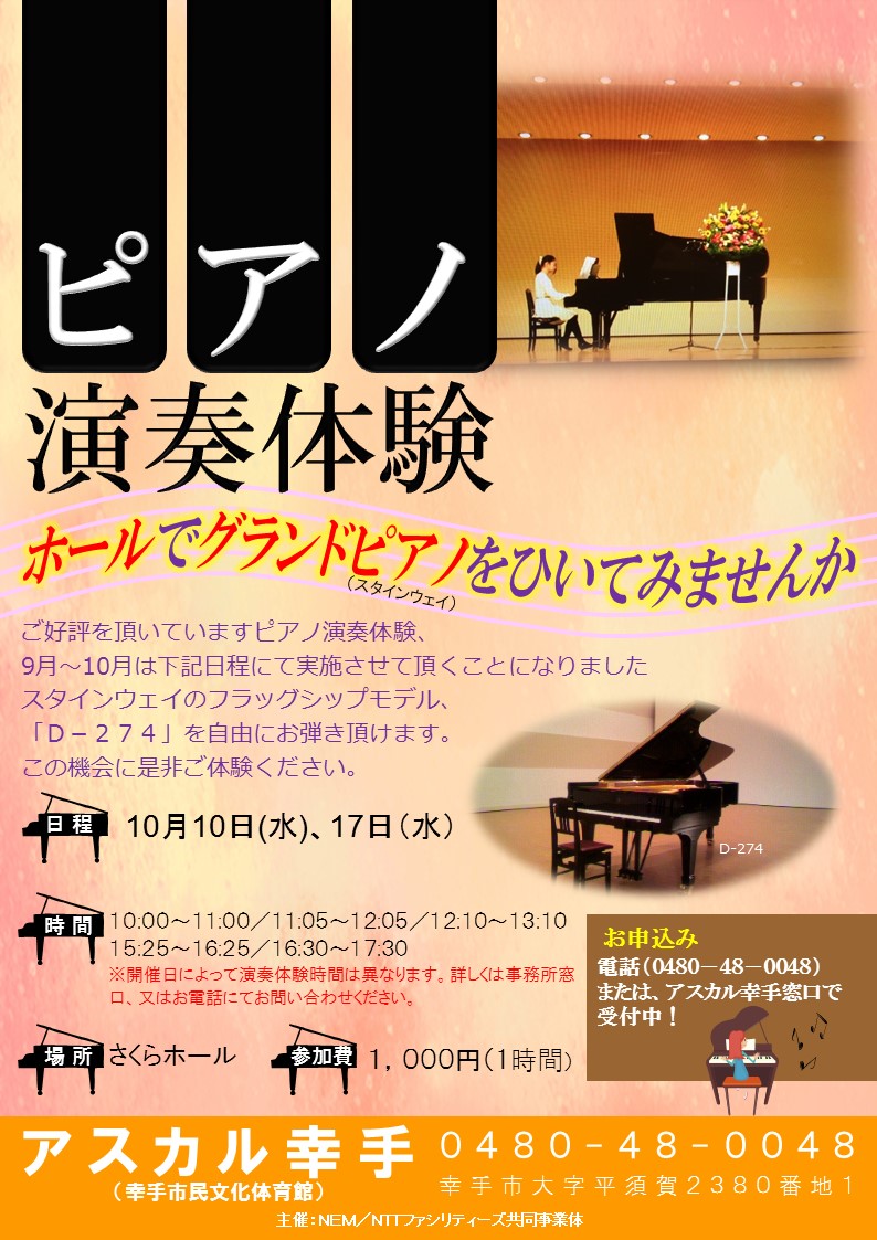 10月のピアノ演奏体験は10月10日と17日に実施します!!スタインウェイの本格的なピアノをホールにて手軽な料金で弾くことが出来ます。