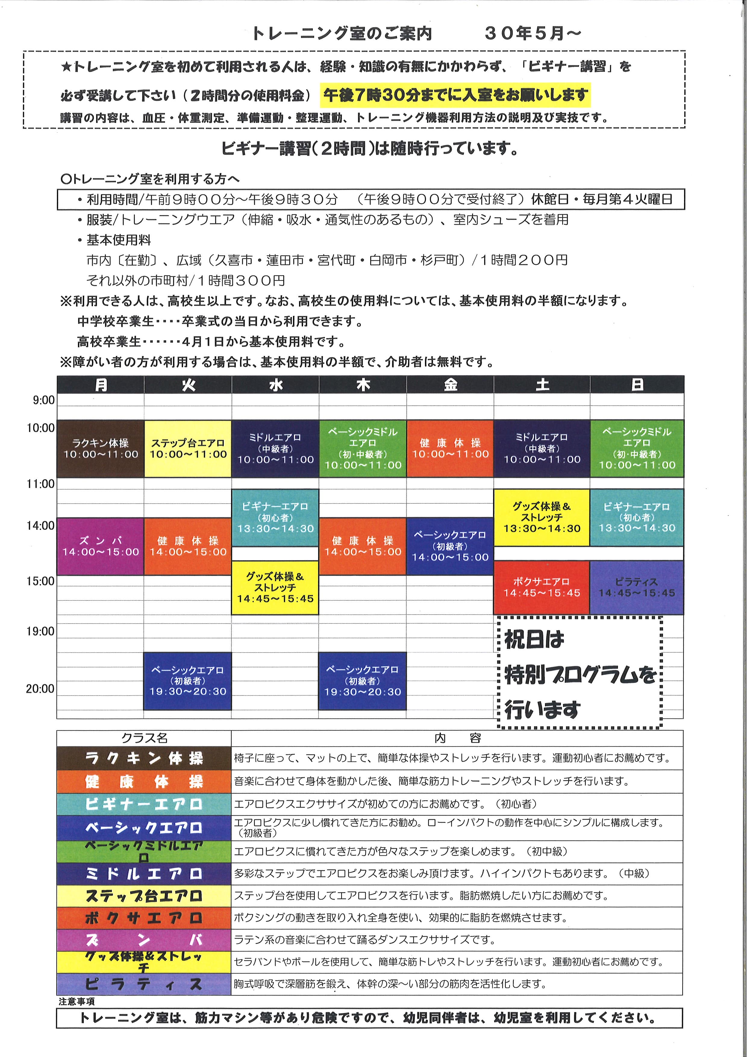 トレーニング室の運動プログラムがが5月7日より変わります。新たにステップ台エアロが入り、