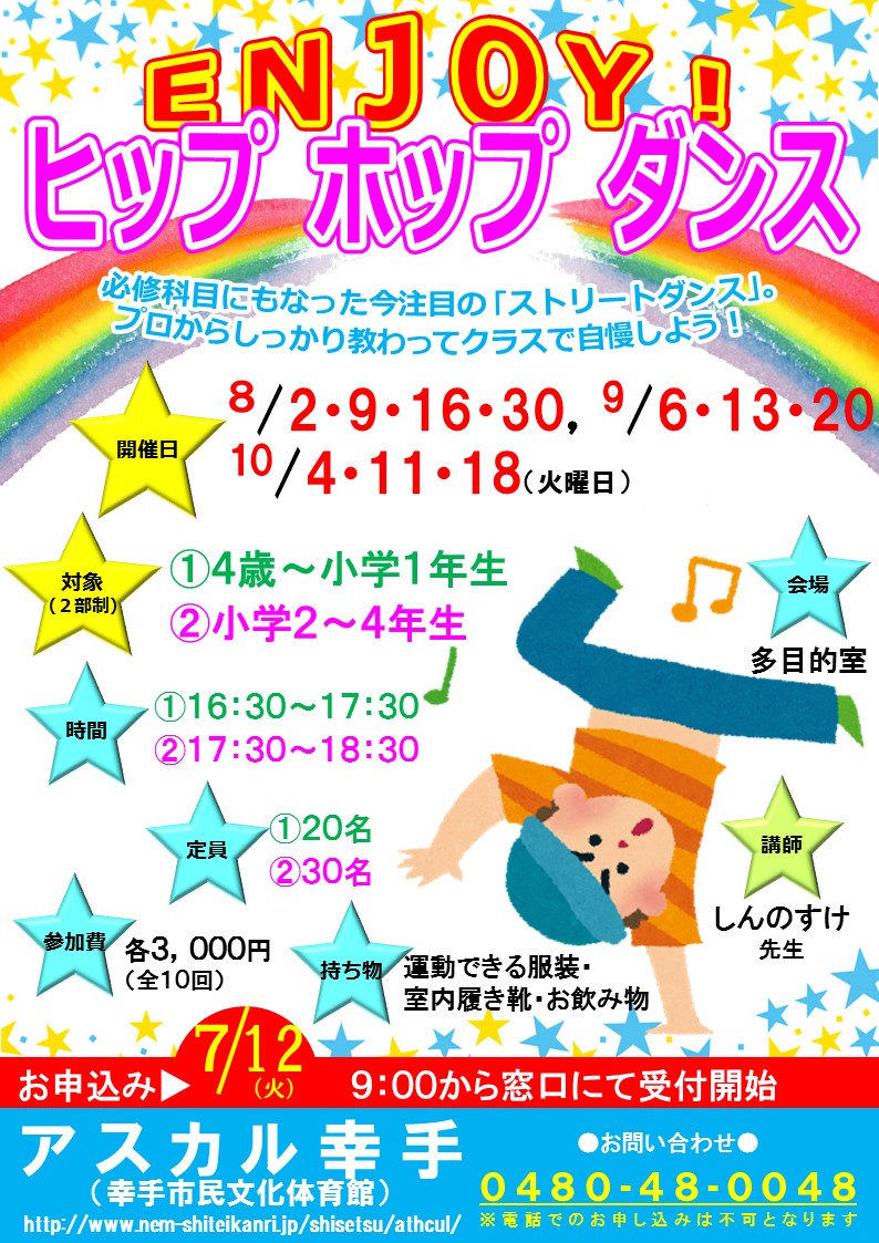 大人気!キッズヒップホップダンス教室を開催いたします。インストラクターは、イケメンダンサーしんのすけ先生。対象者は4歳〜小学4年生まで。@4歳〜1年生(定員20名)16:30〜17:30※受付終了しました。A2年生〜4年生17:30〜18:30(定員30名)となっております。受付が7/12(火)9:00〜窓口にて申込用紙記入、ご入金ください。大変、人気のある教室です。定員なり次第終了させていただきます。※電話でのご予約はできません。