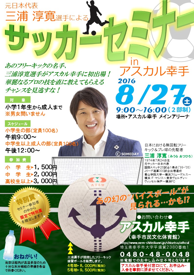 8月27日(土)メインアリーナにて元日本代表三浦淳寛選手のサッカーセミナーを開催いたします。フリーキックの名手である三浦選手からの直接指導となります。午前9:00〜小学生の部(定員100名)午後12:00〜中学生以上成人の部(定員100名)参加対象は、小学1年生〜成人まで※男女は問いません。参加費は、小学生1,500円、中学生2,000円、高校生以上3,000円。定員になり次第終了させていただきます。セミナー参加者の中から限定で特別賞もあります。皆様のご参加をお持ちしております。※当日は、三浦選手が開発したフリーキック専用ボールを販売いたします。4号球8,000円(税別)5号球9,500円(税別)受付開始は、7月18日(月)からとさせていただきます。