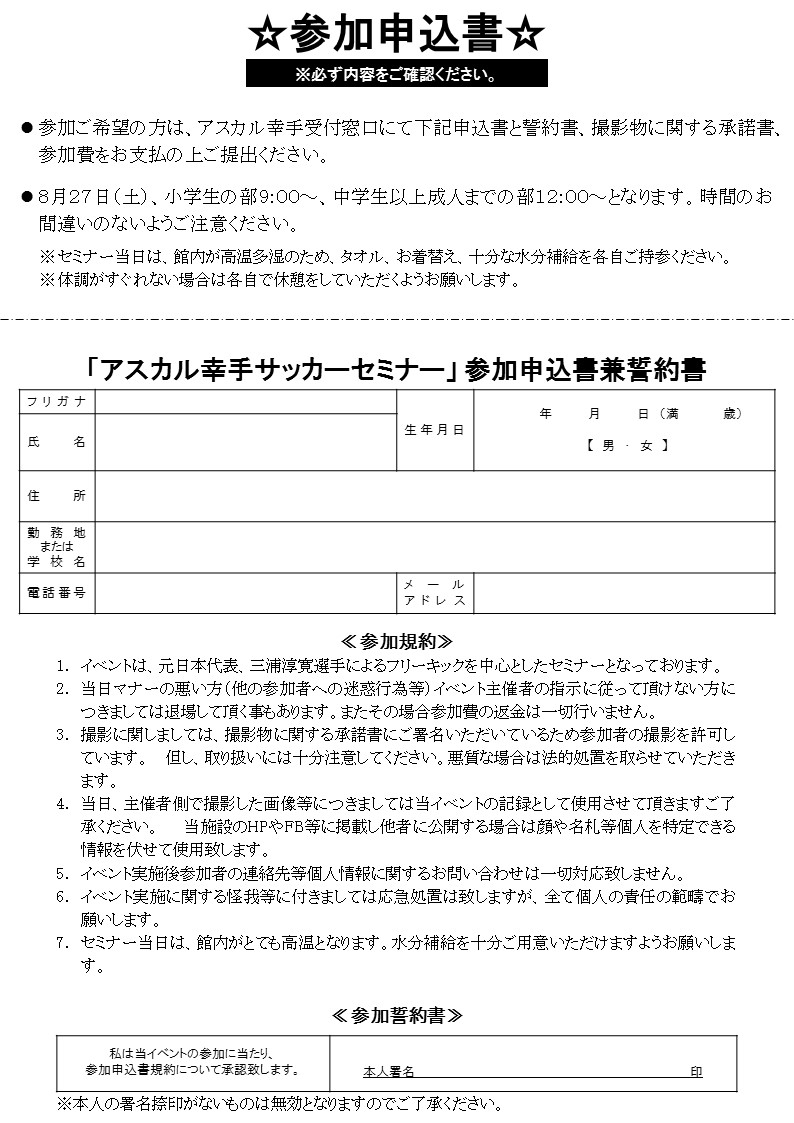 8月27日(土)元日本代表 三浦淳寛選手サッカーセミナーinアスカル幸手※7/18(月)〜受付開始!
