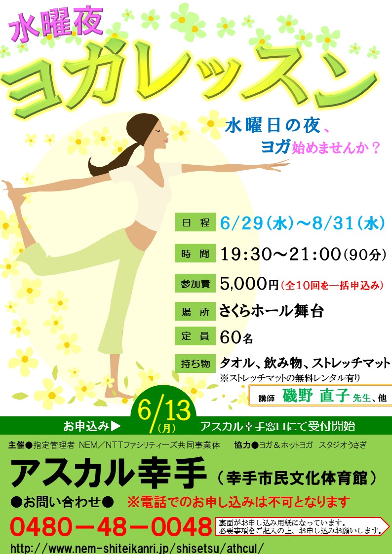 水・金ヨガ教室のおしらせ。ご好評いただいておりますヨガ教室のお申込みは、6月13日月曜日から受付開始になります。アスカル幸手受付事務所にて申込書、ご入金を済ませて申し込み完了となります。詳しくは、月・水・金ヨガ案内をご覧くださいませ。※月曜夜ヨガは定員のため受付終了しました。