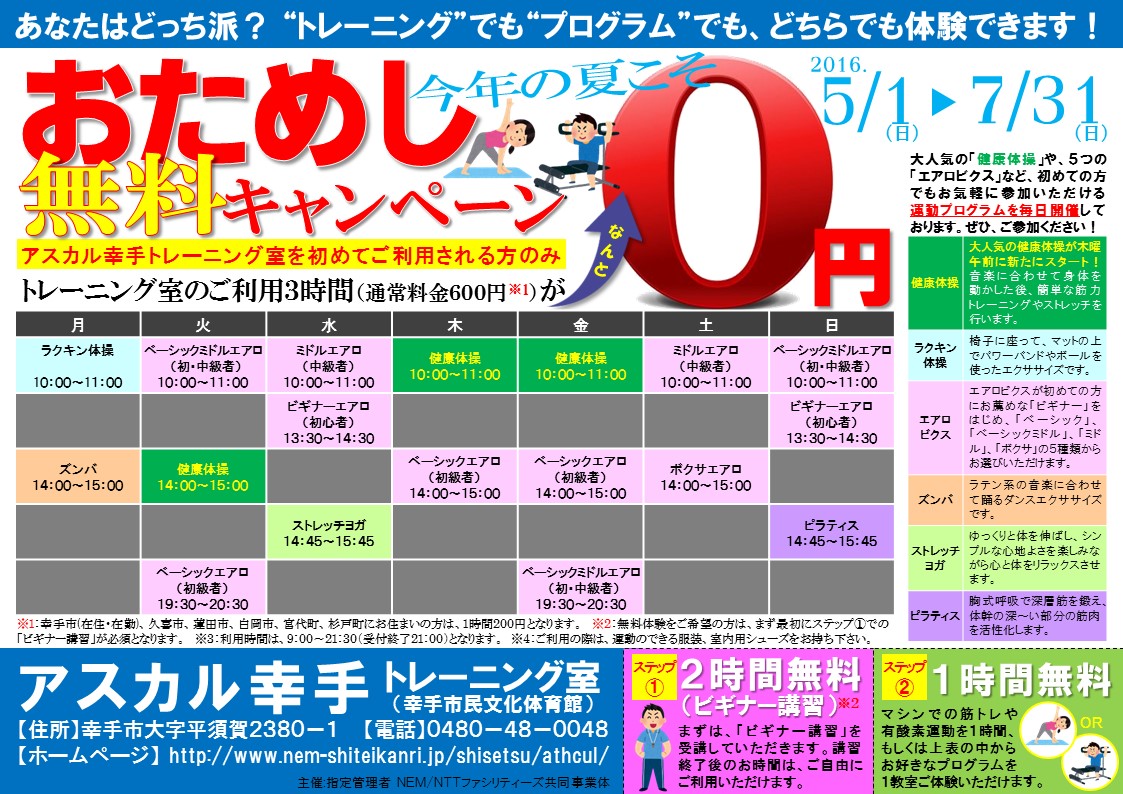アスカル幸手、トレーニング室をご利用されたことがない貴方!チラシをご持参いただければビギナー講習を含む3時間無料にてトレーニング、プログラムにご参加いただけます!!※トレーニング室をはじめてご利用される方限定。また、最初にビギナー講習を必ずご参加いただきます。PM19:30最終受付。運動の出来る服装、室内靴、タオル、お飲み物をご持参ください。詳しくは、アスカル幸手ホームページ、お電話にてお問い合わせください。