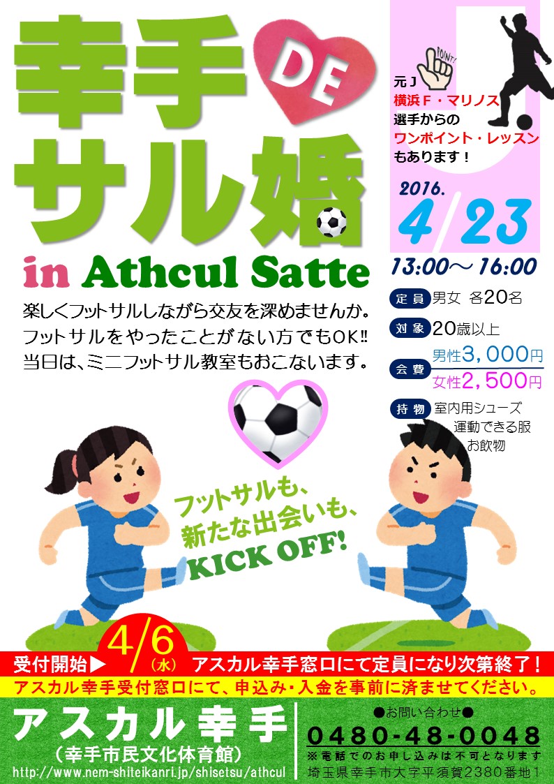 アスカル幸手初企画!婚活「幸手DEサル婚」を行ないます。フットサルをしながら交友をふかめませんか?定員各男女20名・対象20歳以上・参加費男性3,500円 女性2,500円・持ち物運動のできる服装、室内用シューズ、タオル。皆様のご参加をお待ちしております!!どうしよかな〜って思ったら勇気を出してはじめの一歩を踏み出しましょう!!皆様の幸せのお手伝いを全力でサポートします!