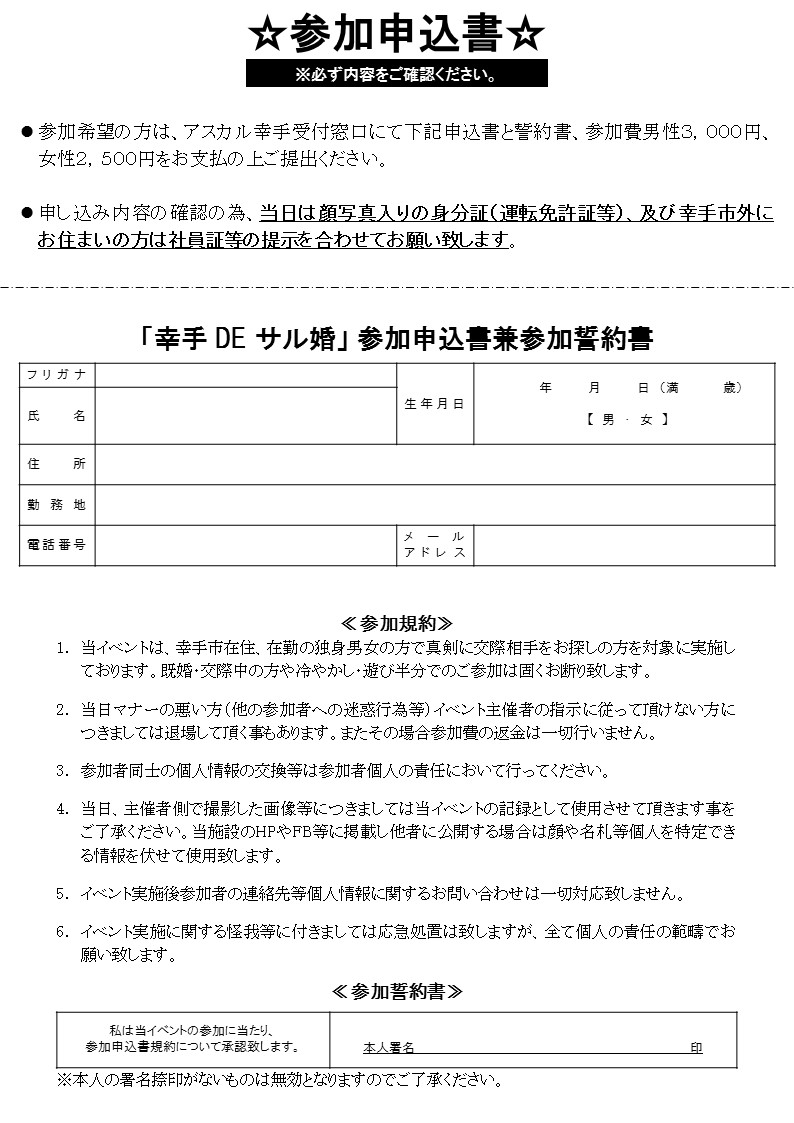 第1回婚活!「幸手DEサル婚」参加者大募集!!※受付4/6(木)スタート!