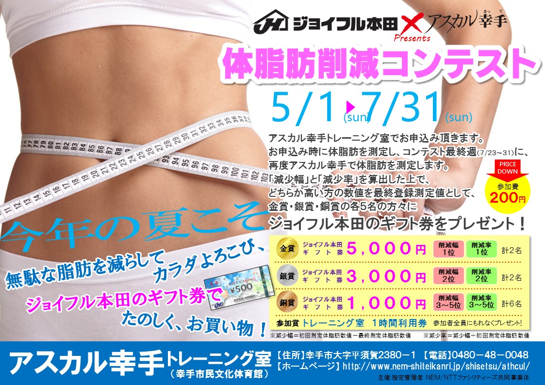 毎年恒例イベント!第3回ジョイフル本田Presents【体脂肪削減コンテスト】を開催いたします。期間は、5/1〜7/31まで体脂肪削減幅・削減率を競い、各上位金・銀・銅の合計10名様にジョイフル本田幸手店でご利用いただける商品券(1,000円〜5,000円)をプレゼントいたします!!また、金・銀・銅に入らなかった方にも参加賞として、最終測定後にトレーニング室1時間利用券をもれなく差し上げます。しかも参加費は200円とプライスダウンしました。これから薄着になる季節、無駄な体脂肪を減らし格好良く堂々と着こなしましょう!