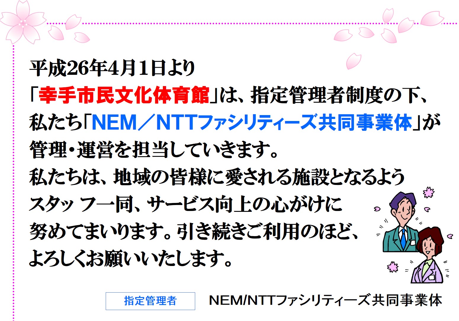 平成26年4月1日より、幸手市民文化体育館(アスカル幸手)は指定管理者としてNEM/NTTファシリティーズ共同事業体が管理・運営を行わせていただきます。利用者の皆様にとってより良い施設づくりをめざし、スタッフ一同尽力してまいります。