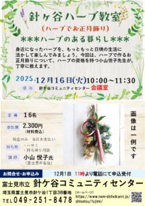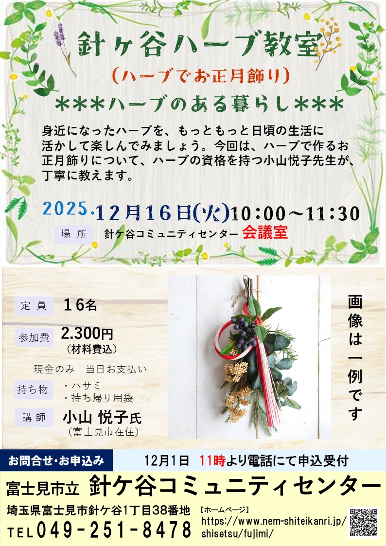 針ケ谷ハーブ教室 ハーブでお正月飾り 日時 12月16日(火) 10時~11時30分 場所 針ケ谷コミュニティセンター会議室 定員 16名 材料費込参加費 2300円 現金のみ 当日お支払い 持ち物 ハサミ(園芸バサミ、花バサミ、キッチンバサミなど) 講師 小山悦子 氏 お問合せ お申込み 12月1日 11時より 電話にて 申込受付 埼玉県富士見市針ケ谷1-38 富士見市立針ケ谷コミュニティセンター 電話 049-251-8478