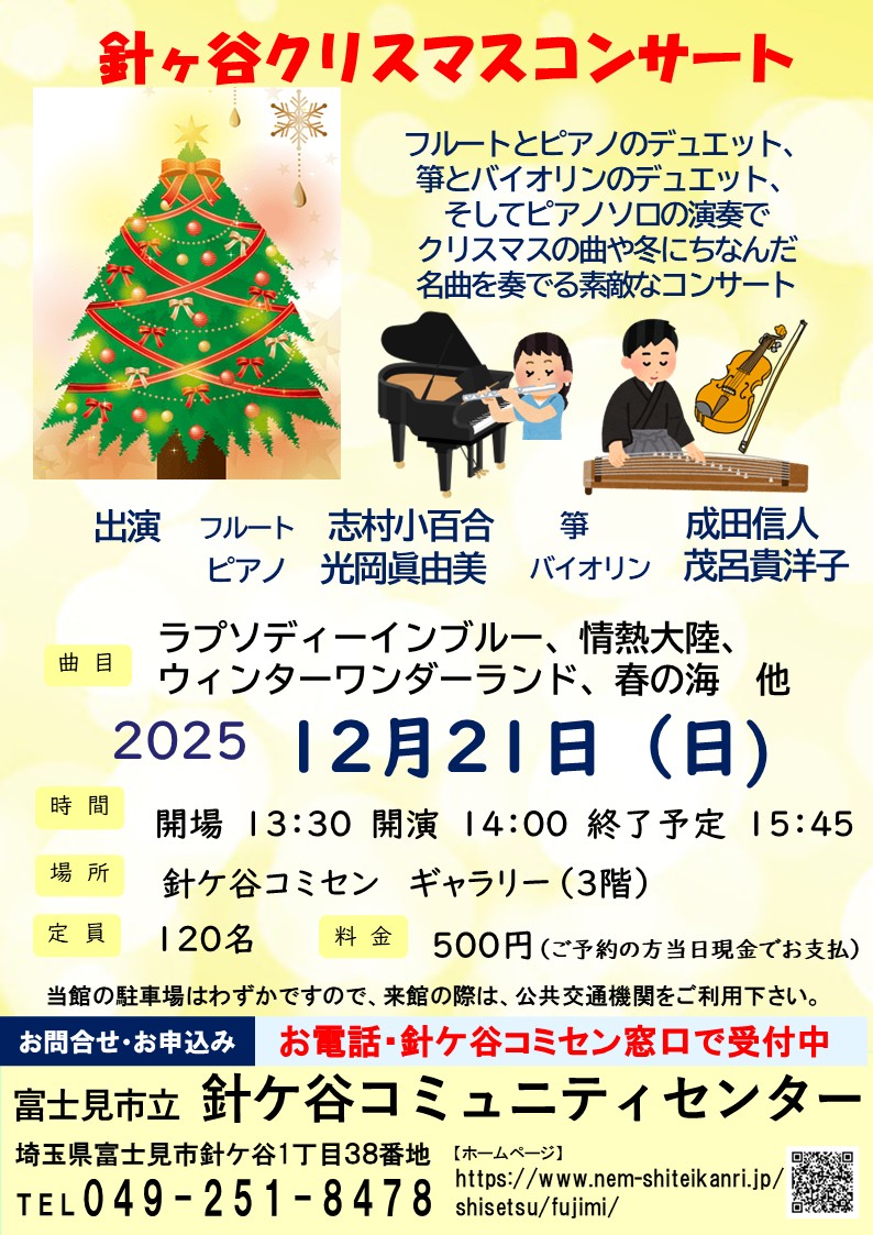 針ケ谷クリスマスコンサート 出演 フルート 志村小百合 ピアノ 光岡眞由美 箏 成田信人 バイオリン 茂呂貴洋子 曲目 情熱大陸 春の海 他 12月 21日(日) 13時30分開場 14時開演 場所 針ケ谷コミュニティセンター ギャラリー 料金 500円 ご予約の方 当日現金でお支払い お問合せ お申込み 針ケ谷コミュニティセンター 電話 049-251-8478 で受け付けております 定員120名になり次第 受付終了