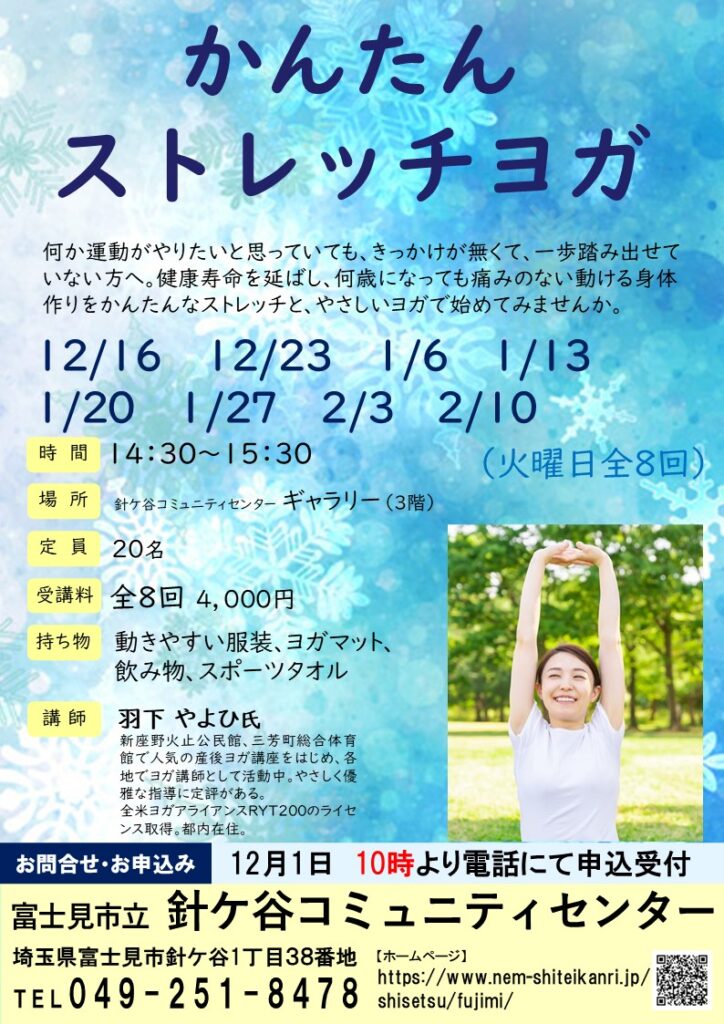かんたんストレッチヨガ教室 日時 12月16日~2月10日 火曜日 全8回 場所 針ケ谷コミュニティセンター ギャラリー 定員 20名 受講料 全8回 4000円 持ち物 動きやすい服装 ヨガマット 水分補給 スポーツタオル 講師 羽下やよひ 氏 お問合せ お申込み 12月1日 10時より 電話にて 申込受付 埼玉県富士見市針ケ谷1-38 富士見市立針ケ谷コミュニティセンター 電話 049-25-8478