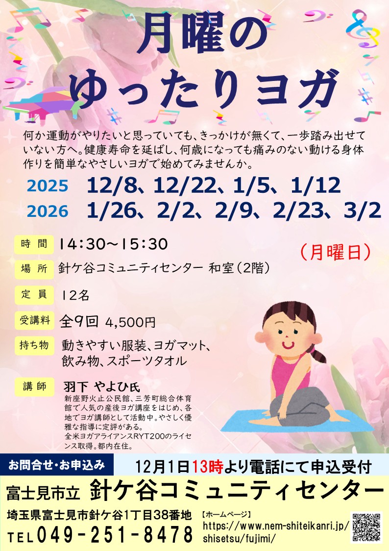 月曜のゆったりヨガ教室 日時 12月8日~3月2日 月曜日 全9回 場所 針ケ谷コミュニティセンター2階和室 定員 12名 受講料 全9回 4500円 持ち物 動きやすい服装 ヨガマット 水分補給 スポーツタオル 講師 羽下やよひ 氏 お問合せ お申込み 12月1日 13時より 電話にて 埼玉県富士見市針ケ谷1-38 針ケ谷コミュニティセンター 電話 049-251-8478