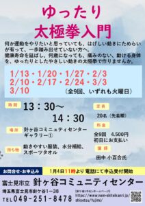 ゆったり太極拳入門 日時 1/13 1/20 1/27 2/3 2/10 2/17 2/24 3/3 3/10 全9回 13:30~14:30 火曜日 場所 針ケ谷コミュニティセンター ギャラリー 定員 20名 料金 4500円 初日に現金でお支払い 講師 田中小百合 先生 申込 1月4日 11時より 電話にて 受付 針ケ谷コミュニティセンター 電話 049-251-8478