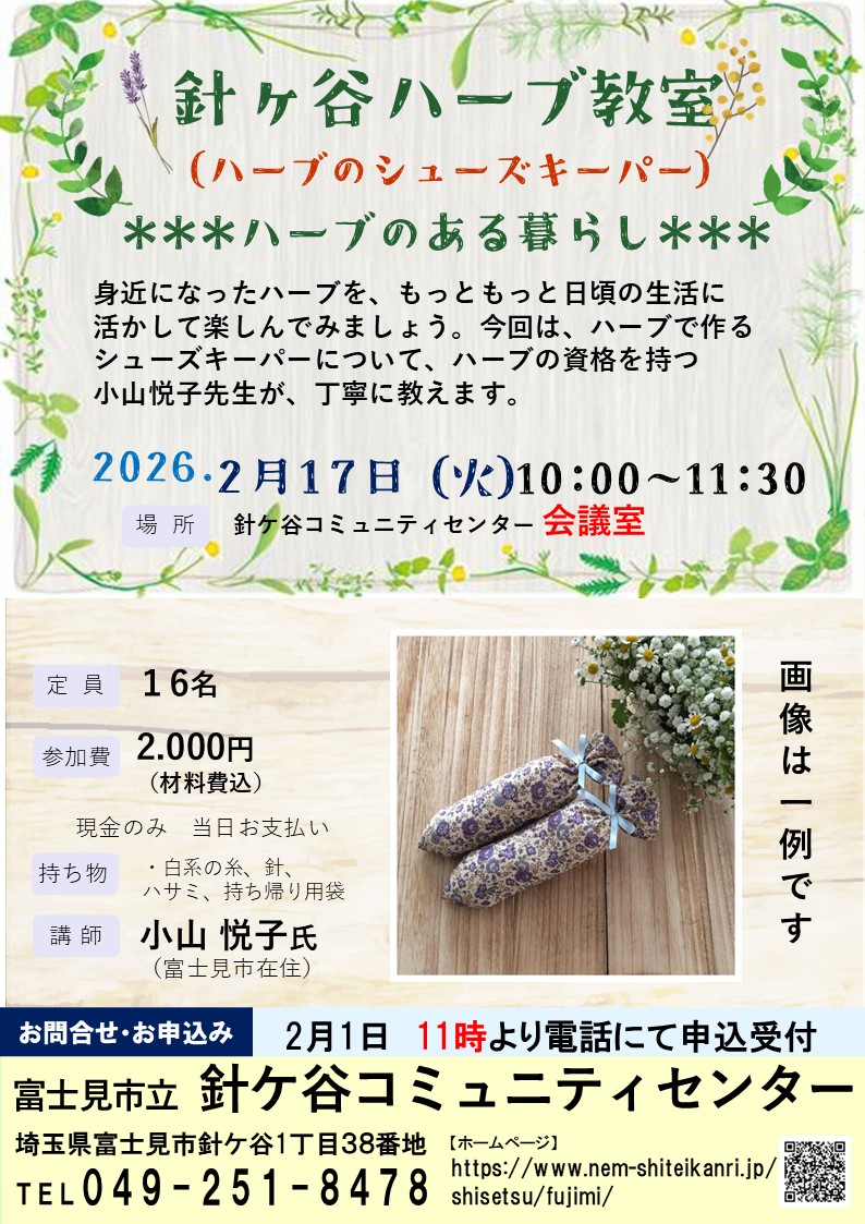 針ケ谷ハーブ教室 ハーブのシューズキーパーを作ろう 日時 2月17日(火) 10時~11時半 場所 針ケ谷コミュニティセンター 会議室 定員 16名 参加費 2000円(材料込み) 持ち物 白系の糸 縫い針 ハサミ 持ち帰り用袋 講師 小山 悦子 先生 お申込み 2月1日 11時より 電話にて 受付 針ヶ谷コミュニティセンター 049-251-8478