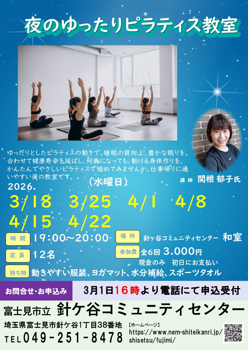 夜のゆったりピラティス教室 日時 3/18 3/25 4/1 4/8 4/15 4/22 毎週水曜日 19時~20時 場所 針ケ谷コミュニティセンター2階和室 定員 12名 受講料 3000円 持ち物 動きやすい服装 飲み物 スポーツタオル 講師 関根郁子 先生 お申込み 3月1日 16時 より 電話にて 受付 針ケ谷コミュニティセンター 049-251-8478